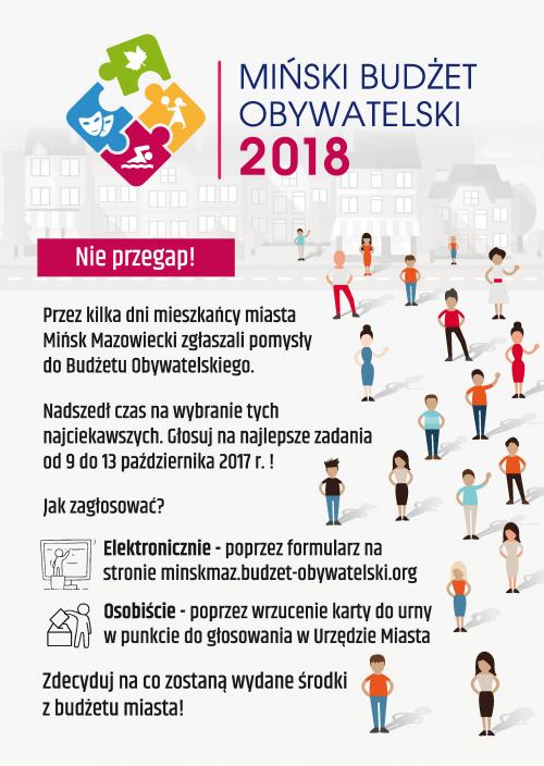 W załączeniu lista zadań zaopiniowanych pozytywnie w ramach budżetu partycypacyjnego Miasta Mińsk Mazowiecki na rok 2018. Głosowanie na pozytywnie zaopiniowane zadania odbędzie się w dniach 9-13 października 2017. Szczegóły dotyczące głosowania dostępne będą na stronie minskmaz.budzet-obywatelski.org