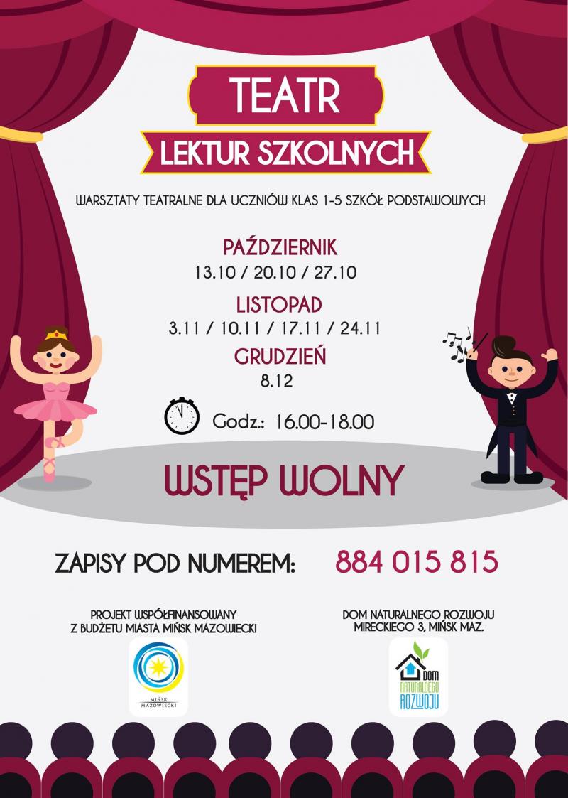 W ramach projektu współfinansowanego przez Miasto Mińsk Mazowiecki, zapraszamy na kolejny cykl warsztatów prowadzonych przez Urszulę Brzost, założycielkę Teatr Lalek Dużych Pianka. To połączenie zabawy oraz różnych form sztuki teatru, gdzie dzieci poprzez krótkie inscenizacje, opracują wybrane lektury szkolne, dzięki czemu łatwiej przyswoją materiał z języka polskiego w szkole.