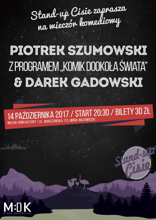 W podróż komediowym szlakiem dookoła świata zabierze nas Piotrek Szumowski, który występował w ponad trzydziestu krajach, na pięciu kontynentach, w trzech językach. Tak jest, Piotrek przeżył 409 dni podróży dookoła świata. Jak on to zrobił? Nikt tego nie wie. W komicznej podróży towarzyszył mu będzie Darek Gadowski.