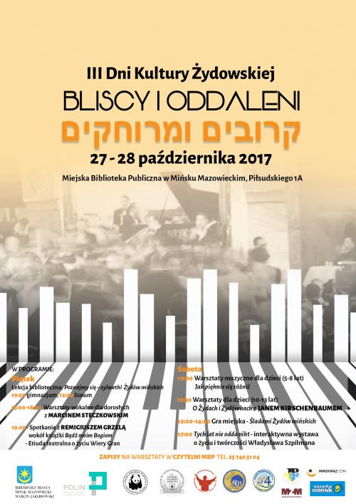 Z radością zapraszamy do udziału w wydarzeniach III Dni Kultury Żydowskiej Bliscy i Oddaleni, które odbędą się w dniach 27-28 października 2017r. w Miejskiej Bibliotece Publicznej w Mińsku Mazowieckim.