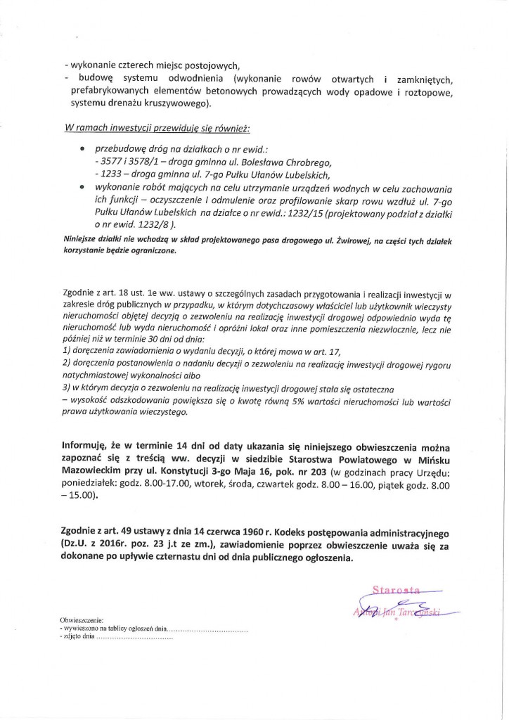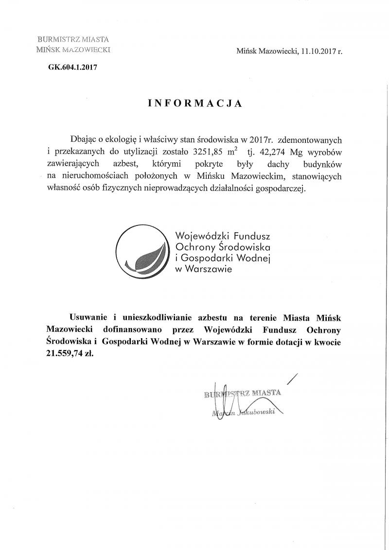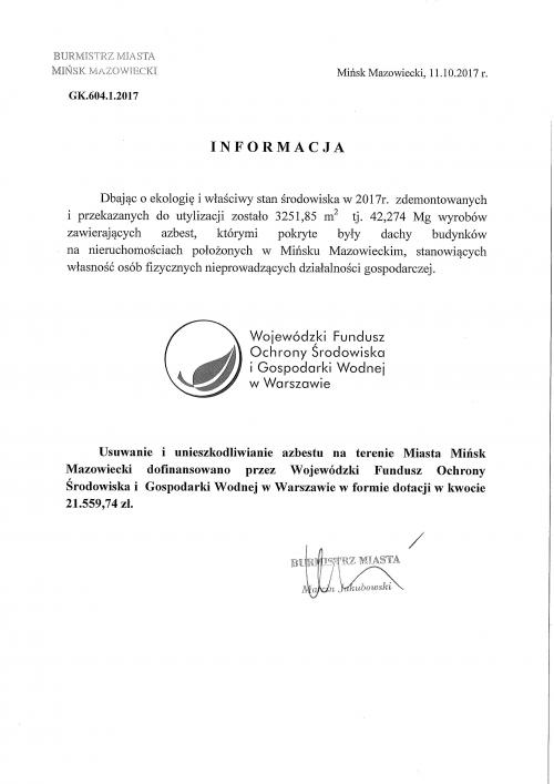 W ramach Regionalnego Programu Operacyjnego Województwa Mazowieckiego na lata 2014-2020 (działanie 5.1. „Dostosowanie do zmian klimatu”) Miastu Mińsk Mazowiecki przyznano dofinansowanie w wysokości 258 792,00 zł do „Budowy systemu ostrzegania i alarmowania ludności o zagrożeniach dla Miasta Mińsk Mazowiecki”.
