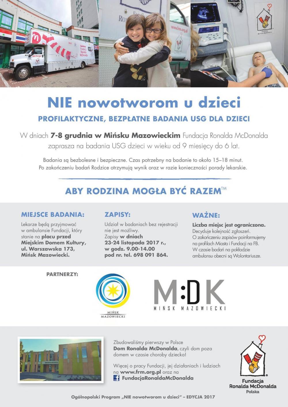 W dniach 23-24 listopada w godzinach 9.00-14.00 prowadzone będą zapisy na bezpłatne badania USG małych mińszczan. Szczegóły na plakacie. Program zdrowotny sfinansowany z budżetu Miasta Mińsk Mazowiecki.