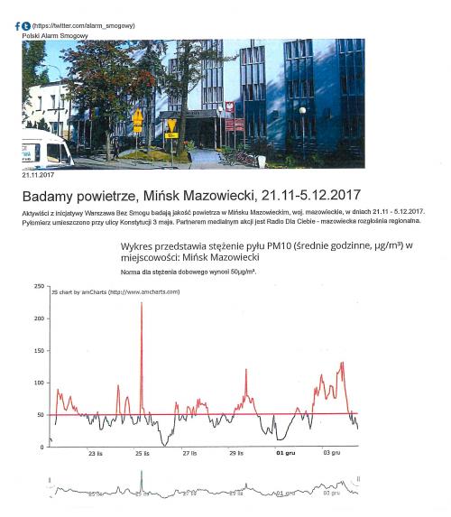 W dniach 21.11-05.12.2017 r. w Mińsku Mazowieckim przy ul. Konstytucji 3 Maja umieszczono pyłomierz do badania jakości powietrza – stężenia pyłu PM 10. Prezentowane wyniki niestety nie są zbyt optymistyczne. Rano oraz w godzinach popołudniowych i wieczornych można było zaobserwować znaczny wzrost zanieczyszczenia powietrza, często przekraczający normę; a w sobotni poranek 25 listopada 2017 r. nastąpił gwałtowny, bardzo wysoki (prawie 220 µg/m3) odczyt stężenia pyłu PM 10. Po „porannym dołożeniu do pieca”, a w szczególności w godzinach nocnych - poziom zanieczyszczenia znacznie się obniża, 26 listopada 2017 r., ok. godz. 600 pyłomierz wskazuje rekordowo niskie stężenie - 1 µg/m3.