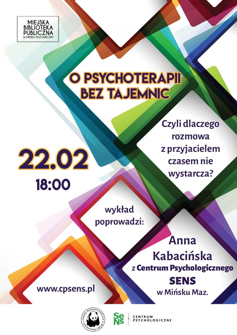Zapraszamy na wykład "O psychoterapii bez tajemnic", który 22 lutego o godz.18.00 poprowadzi Anna Kabacińska z mińskiej poradni CS Sens.