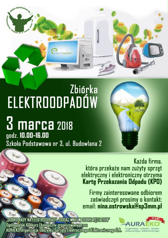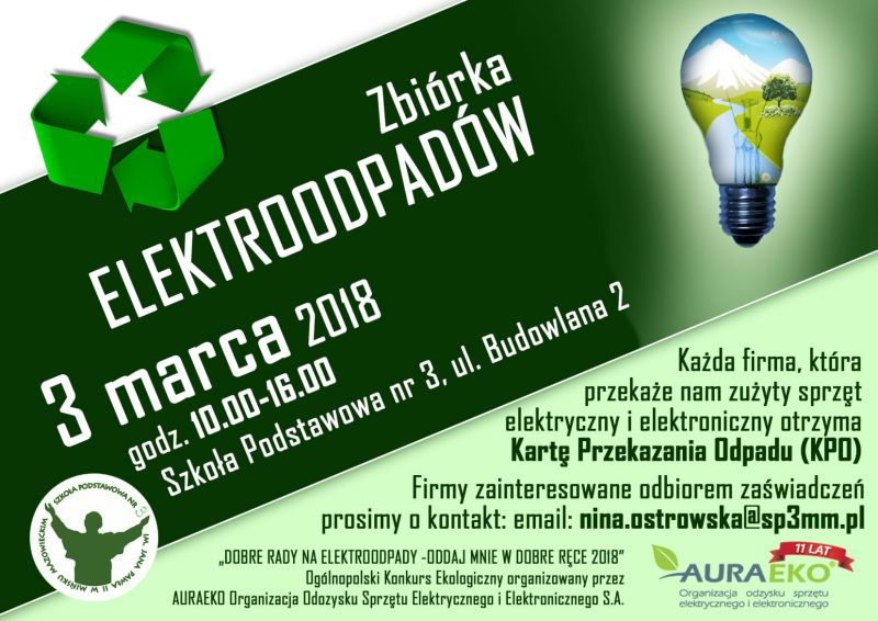 Każda firma, która przekaże zużyty sprzęt elektryczny lub elektroniczny, otrzyma Kartę Przekazania Odpadu (KPO). Zainteresowanych prosimy o kontakt z koordynatorką akcji, nauczycielka fizyki i chemii, Niną Ostrowską (e-mail: nina.ostrowska@sp3mm.pl).