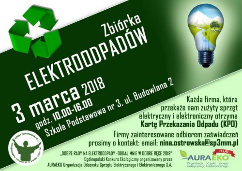 Zbiórka przeprowadzona zostanie w ramach Ogólnopolskiego Konkursu Ekologicznego „Dobre rady na elektroodpady – oddaj mnie w dobre ręce 2018” organizowanego przez AURAEKO Organizację Odzysku Sprzętu Elektrycznego i Elektronicznego S.A. Im więcej sprzętu zostanie zebrane podczas tej sobotniej akcji, tym większa szansa na nagrody dla szkoły i uczniów.
