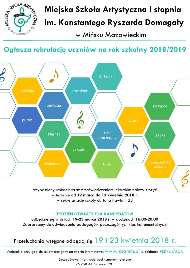 Miejska Szkoła Artystyczna I stopnia im. Konstantego Ryszarda Domagały w Mińsku Mazowieckim ogłasza rekrutację uczniów na rok szkolny 2018/2019