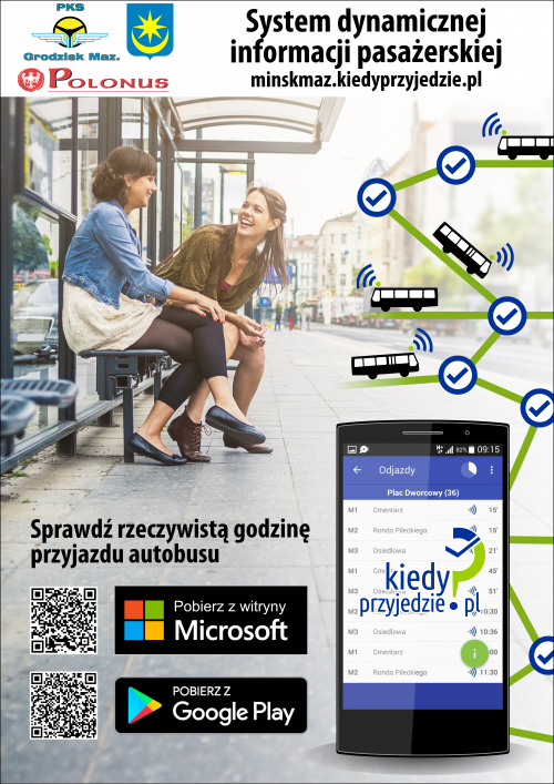 Z przyjemnością informujemy o wdrożeniu w Mińsku Mazowieckim systemu dynamicznej informacji pasażerskiej działającego w oparciu o serwis internetowy kiedyPrzyjedzie.pl. Dzięki niemu nasi pasażerowie uzyskali dostęp do rzeczywistych odjazdów autobusów z dowolnego przystanku komunikacji miejskiej.