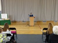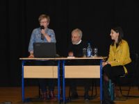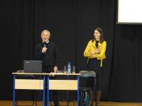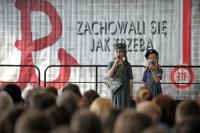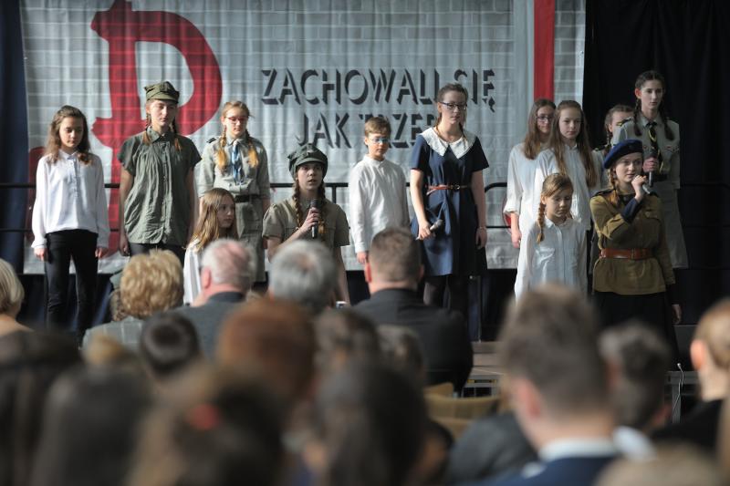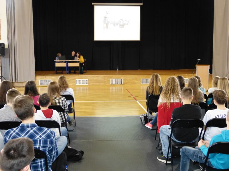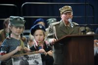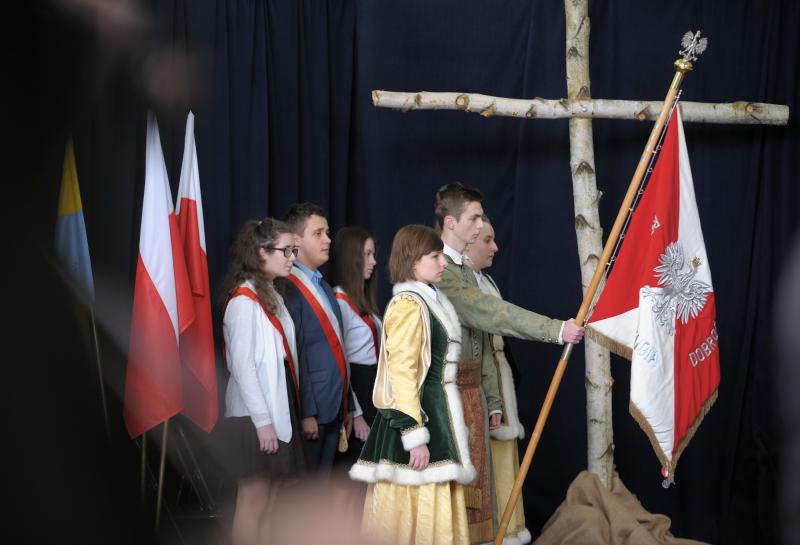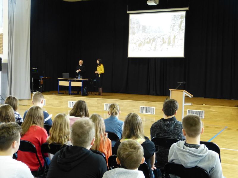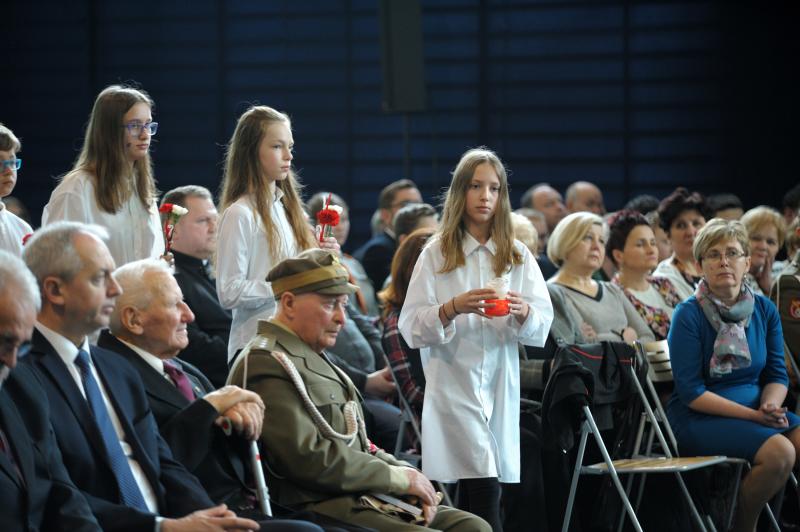 Drugą część rozpoczął montaż słowno-muzyczny. Słowa piosenki “Dziś idę walczyć, mamo” uświadomiły młodszej części widowni powagę wyboru, przed jakim stanęli nasi rówieśnicy ponad 70 lat temu. Do uczestników i organizatorów prezydent Andrzej Duda skierował specjalny list. Głowa państwa nawiązała do obchodzonej w tym roku setnej rocznicy odzyskania niepodległości i dumnie wskazała na możliwość uczczenia prawdziwych bohaterów w wolnym kraju, który nie boi się prawdy i nie wstydzi się własnej historii. Korespondencyjnie swoimi przemyśleniami podzieliła się z nami również pani Danuta Ciesielska - siostrzenica Inki. Przypomniała postać oraz dokonania Danuty Siedzikówny. Wyraziła słowa podziękowania za kultywowanie pamięci o bohaterskiej sanitariuszce. Szkolnym obchodom towarzyszy w tym roku specjalna wystawa IPN-u “Oddziały Łupaszki”. W imieniu tej instytucji głos zabrał dr Dariusz Gałaszewski - naczelnik Oddziałowego Biura Edukacji Narodowej. W wygłoszonej prelekcji scharakteryzował sytuację żołnierzy AK, którzy po 1945r. zdecydowali nie ujawniać się, ale dalej walczyć przeciwko okupantowi radzieckiemu. Często stawali do walki z Polakami, żołnierzami Armii Ludowej. Prelegent zachęcił również do odwiedzenia nowo powstałego Muzeum Żołnierzy Wyklętych i Więźniów Politycznych PRL. Umiejscowione zostało ono w budynku aresztu śledczego przy ul. Rakowieckiej w Warszawie. Więziono tam m.in rtm. Witolda Pileckiego. Jego słowa: “ Oświęcim, przy nich to była igraszka” mówią o bezlitosnym charakterze praktyk stosowanych przez komunistów.