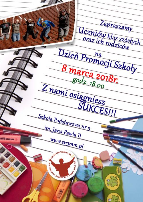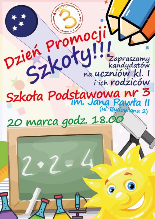 Szkoła Podstawowa nr 3 im. Jana Pawła II w Mińsku Mazowieckim zaprasza szóstoklasistów i ich rodziców na Dzień Promocji Szkoły – 8 marca na godz. 18.00.