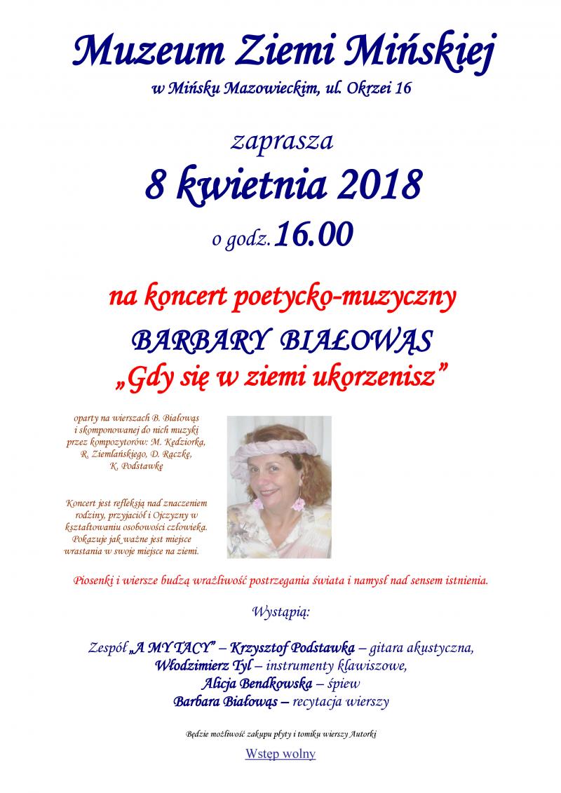 Muzeum Ziemi Mińskiej w Mińsku Mazowieckim, ul. Okrzei 16, zaprasza 8 kwietnia 2018 r. o godz.16.00 na koncert poetycko-muzyczny