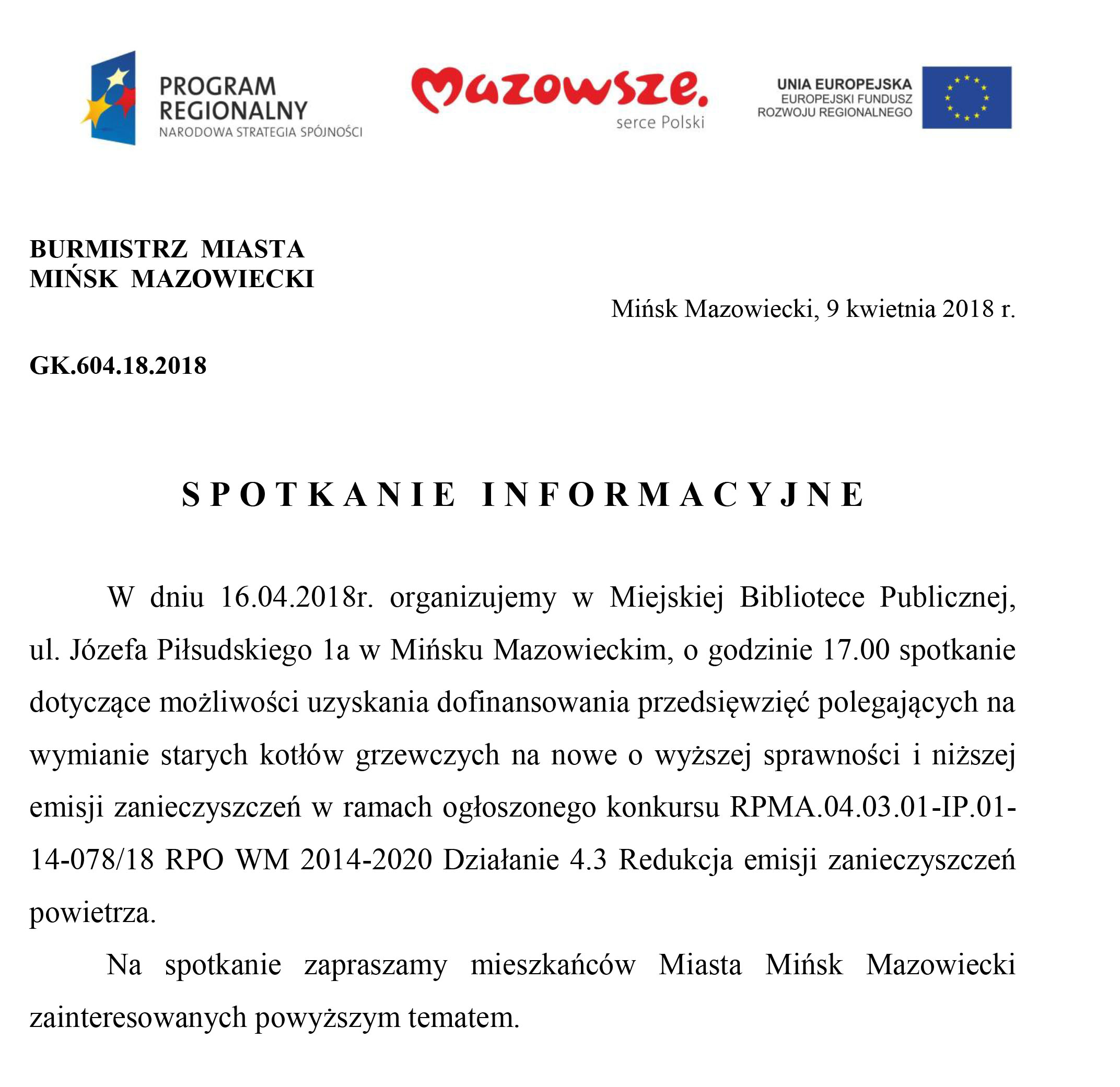 W dniu 16.04.2018r. organizujemy w Miejskiej Bibliotece Publicznej, ul. Józefa Piłsudskiego 1a w Mińsku Mazowieckim, o godzinie 17.00 spotkanie dotyczące możliwości uzyskania dofinansowania przedsięwzięć polegających na wymianie starych kotłów grzewczych na nowe o wyższej sprawności i niższej emisji zanieczyszczeń.