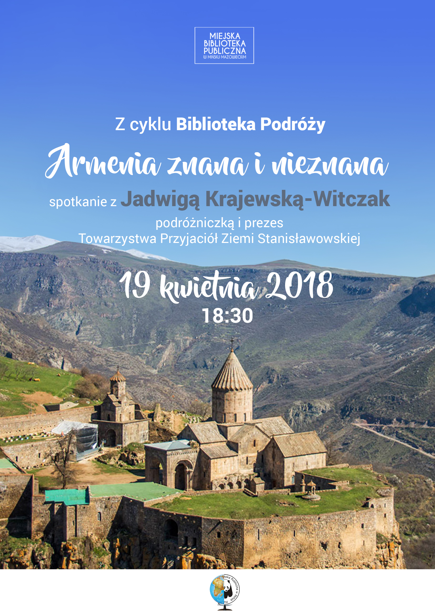W ramach cyklu Biblioteka podróży na wędrówkę wśród wygasłych wulkanów, w cieniu biblijnej góry Ararat zabierze nas Jadwiga Krajewska-Witczak, prezes Towarzystwa Przyjaciół Ziemi Stanisławowskiej. Opowie o smakach, zapachach i krajobrazach Armenii. Wstęp wolny.