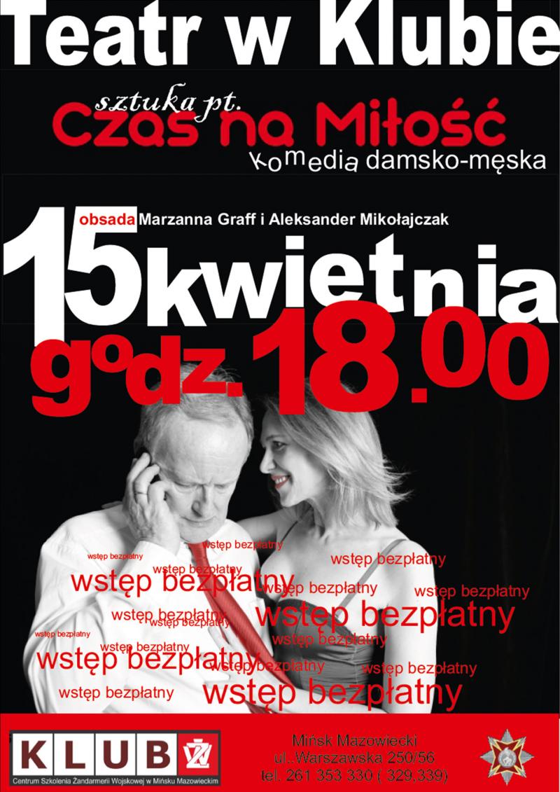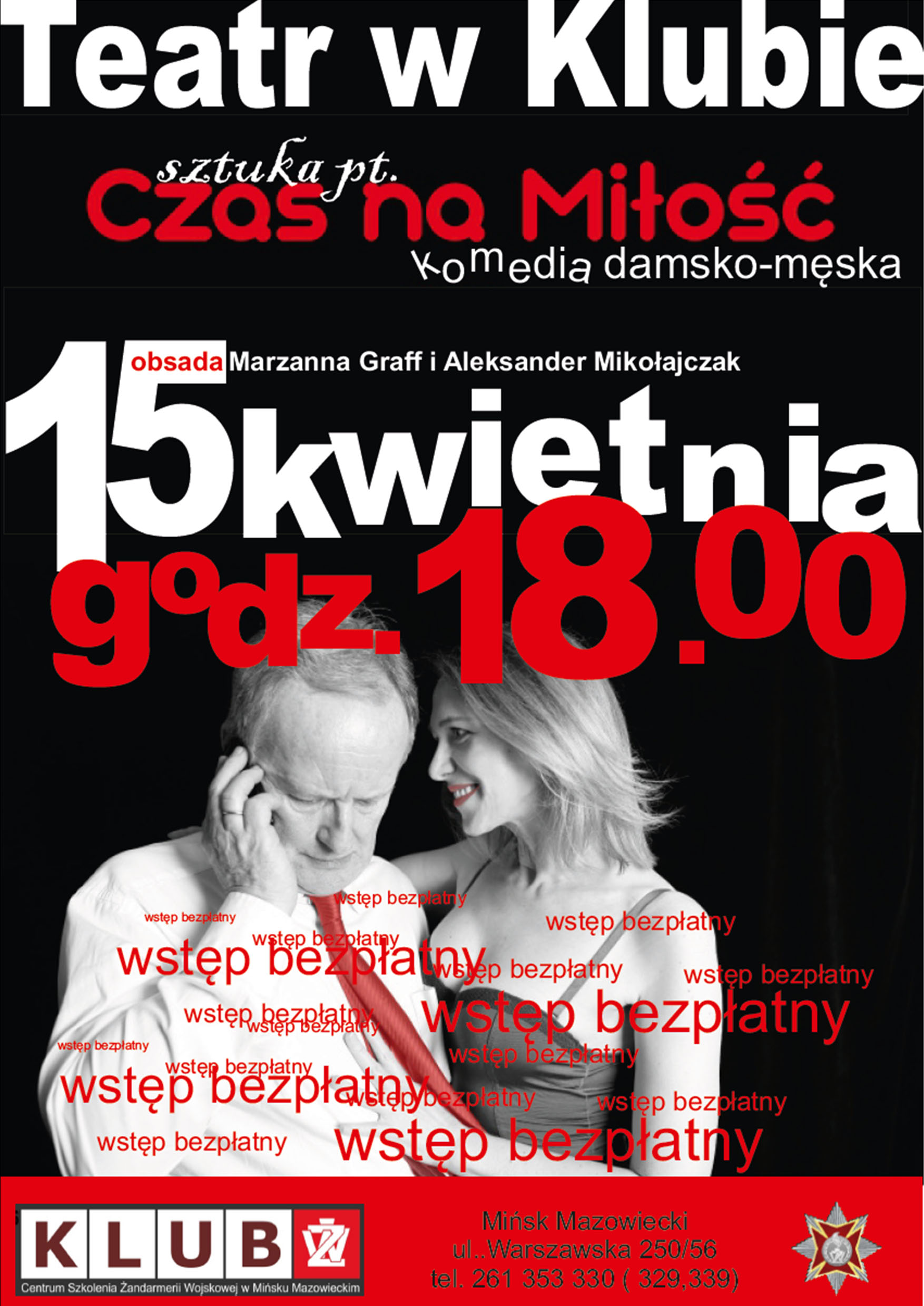 Zapraszamy na spektakl teatralny pt." Czas na miłość", który odbędzie się 15.04.2018r o godz. 18:00 w sali widowiskowej Klubu Centrum Szkolenia Żandarmerii Wojskowej. Więcej szczegółów na plakacie.