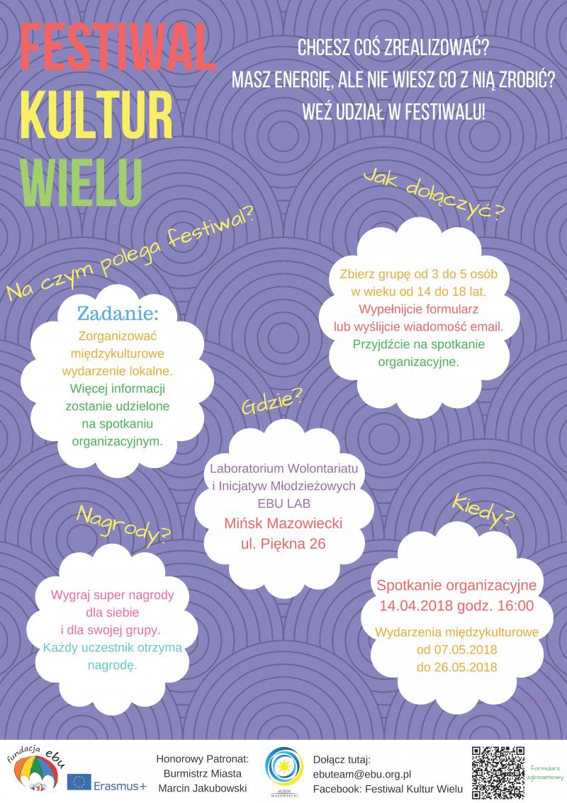 Jeśli chcesz coś zrealizować, masz energię, ale nie wiesz co z nią zrobić? Weź udział w Festiwalu Kultur Wielu z EBU LAB - Laboratorium Wolontariatu i Inicjatyw Młodzieżowych, ul. Piękna 26. Spotkanie organizacyjne 14.04.2018, godz. 16.00...