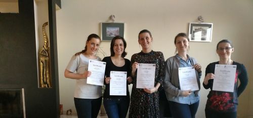 Na zdjęciu (od lewej) – Nauczycielki języka angielskiego ze Szkoły Podstawowej nr 3 im. Jana Pawła II w Mińsku Mazowieckim z certyfikatami z ukończonych kursów zagranicznych: Magdalena Brewczyńska, Ewelina Gromska, Karolina Łada, Ilona Krupa, Marta Zbucka.