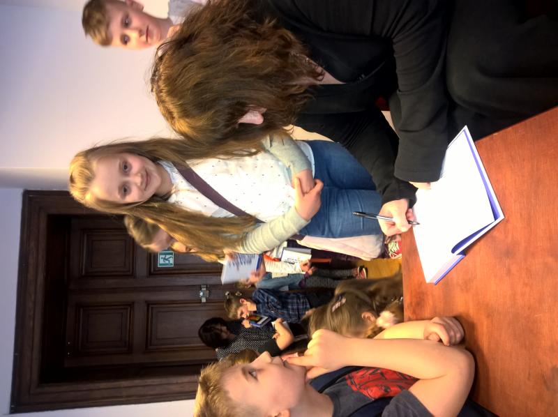 Wyjazd zakończyło kameralne spotkanie z autorką poczytnych książek dla młodzieży, p. Ewą Karwan-Jastrzębską, laureatką wielu nagród, scenarzystką, dziennikarką radiową i telewizyjną. Uczniowie podczas spotkania zakupili książki, które podbiły serca młodych czytelników, pt. Banda Michałka powraca. Autorka opatrzyła je nie tylko autografem, ale również indywidualną dedykacją. Słuchacze zadawali artystce wiele pytań zarówno dotyczących sfery życia zawodowego jak i prywatnego. Uczniowie pytali panią Ewę o Misia Fantazego oraz o to, skąd autorka czerpie pomysły literackie i w efekcie stwierdzili, że przynajmniej niektórzy spośród nich mają predyspozycje, by zostać ludźmi pióra.