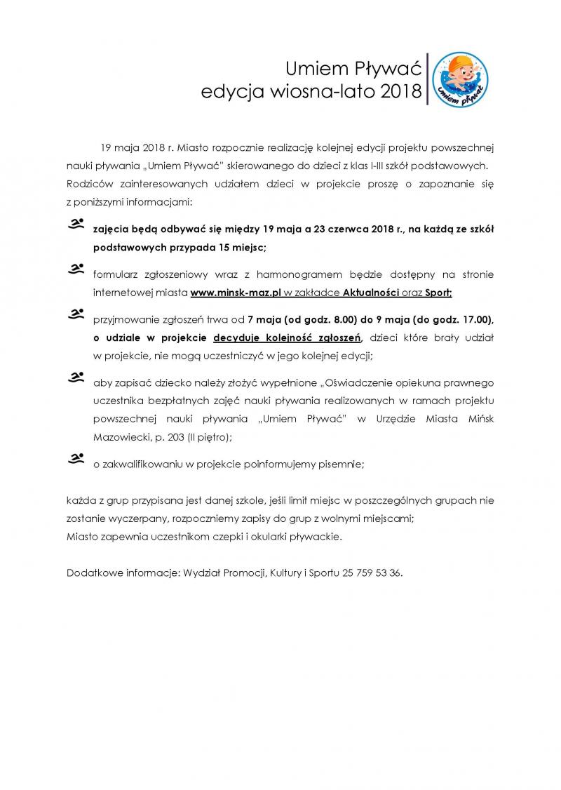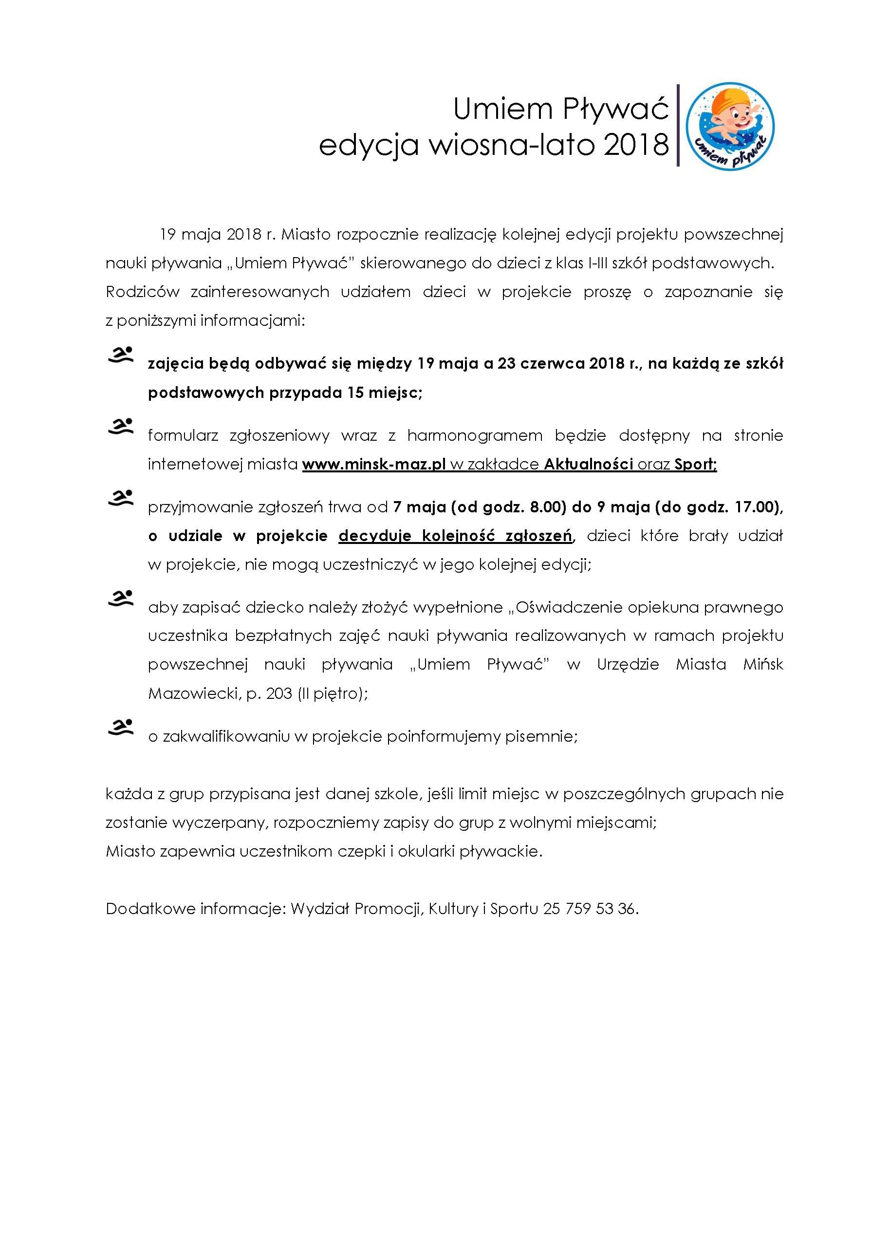 19 maja 2018 r. Miasto rozpoczęło realizację kolejnej edycji projektu powszechnej nauki pływania „Umiem Pływać” skierowanego do dzieci z klas I-III szkół podstawowych.