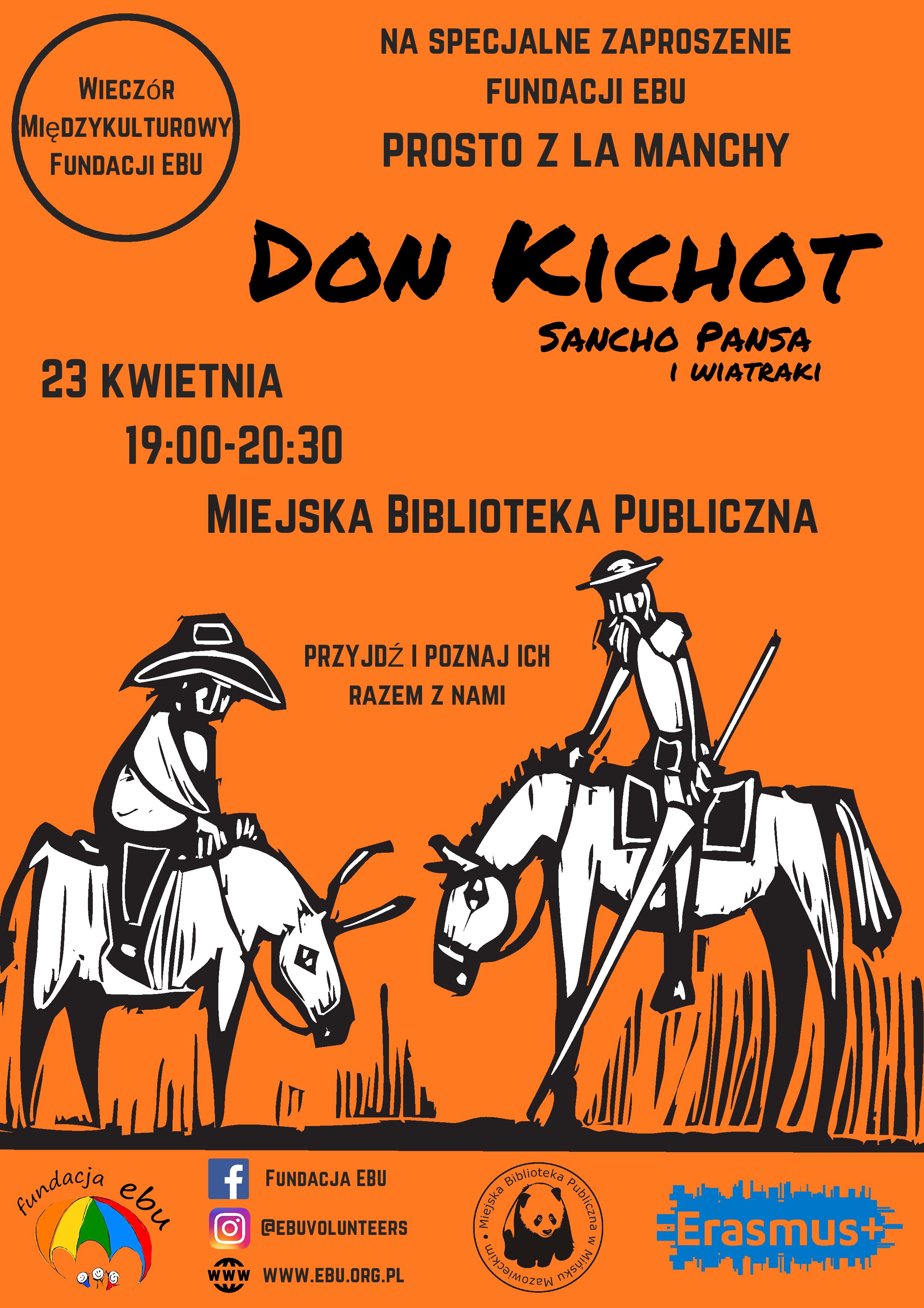 Już w najbliższy poniedziałek, 23 kwietnia, o godzinie 19:00, do Miejskiej Biblioteki Publicznej zawita nikt inny jak tylko… DON KICHOT! Możecie wierzyć lub nie, śmiać się lub dziwić, albo… przyjść na jedyne i niepowtarzalne z nim spotkanie! Jeśli chcecie poznać go osobiście, odkryć ciekawostki architektoniczne na temat wiatraków, z którymi walczył, spróbować porozmawiać z nim oryginalnymi dialogami czy skosztować przekąsek, którymi raczył się w czasie swych podróży, to zapraszamy serdecznie 23.04.18r. do MBP o godz. 19:00 – 20:30 na wieczór międzykulturowy organizowany przez wolontariuszy Fundacji EBU. Do zobaczenia! Adiós!