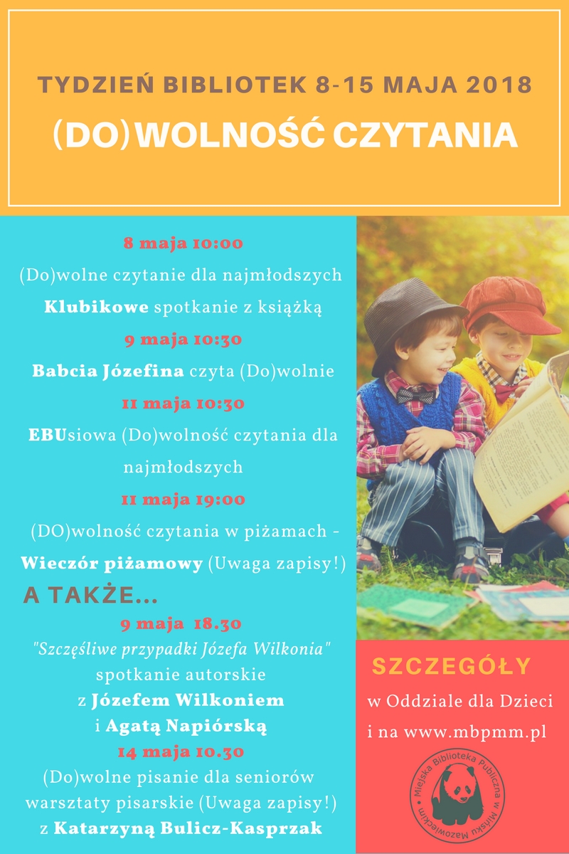 Z okazji Tygodnia Bibliotek dla naszych Czytelników przygotowaliśmy wiele atrakcji. Najmłodsze dzieci spotkają się w Klubiku, posłuchają Babci Józefiny, zaszaleją z EBUsiami. Starsze zapraszamy z rodzicami na spotkanie z genialnym ilustratorem Józefem Wilkoniem i autorką jego biografii Agatą Napiórską, a także na kultowy już wieczór piżamowy. Seniorów zachęcamy do udziału w warsztatach pisarskich z Kasią Bulicz-Kasprzak, z których dowiedzą się jak spisywać wspomnienia. A na powolne chwile w wiosennym ogrodzie lub parku pozostawiamy Wam (DO)WOLNOŚĆ CZYTANIA!