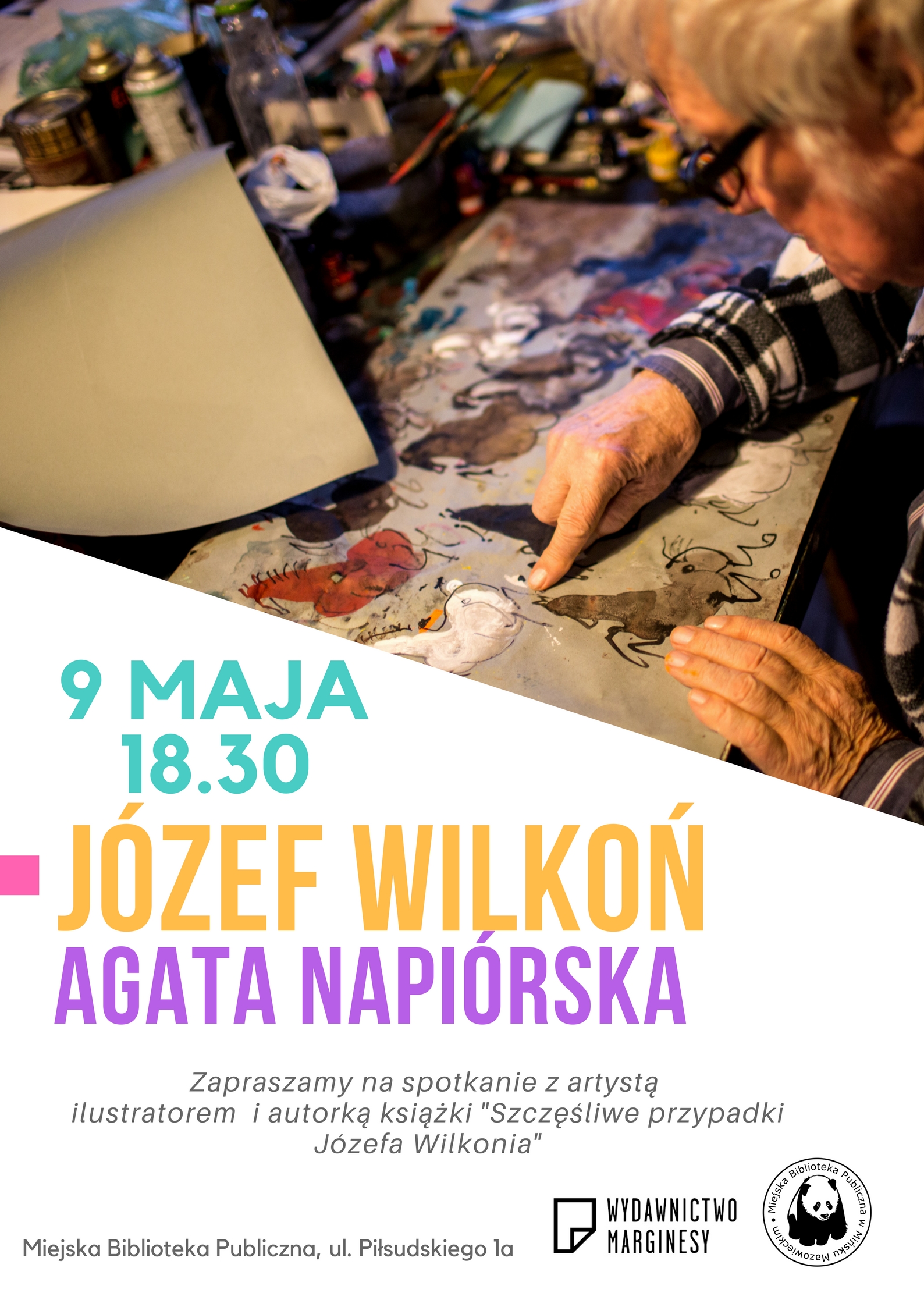„Kreska zamaszysta, ale ruch musi być precyzyjny jak u chirurga. Od dawna urzekały mnie prace o zdecydowanej formie, wynikającej z dynamicznego ruchu ręką. Zwróciłem uwagę na biegłość mistrzów japońskich, którzy duży pędzel maczany w wodzie zamieniali w precyzyjne narzędzie” - tak o swoich obrazach mówi Józef Wilkoń. Na spotkanie z genialnym ilustratorem i autorką książki "Szczęśliwe przypadki Józefa Wilkonia" Agatą Napiórską zapraszamy w Tygodniu Bibliotek, 9 maja o godzinie 18.30. Wstęp wolny.