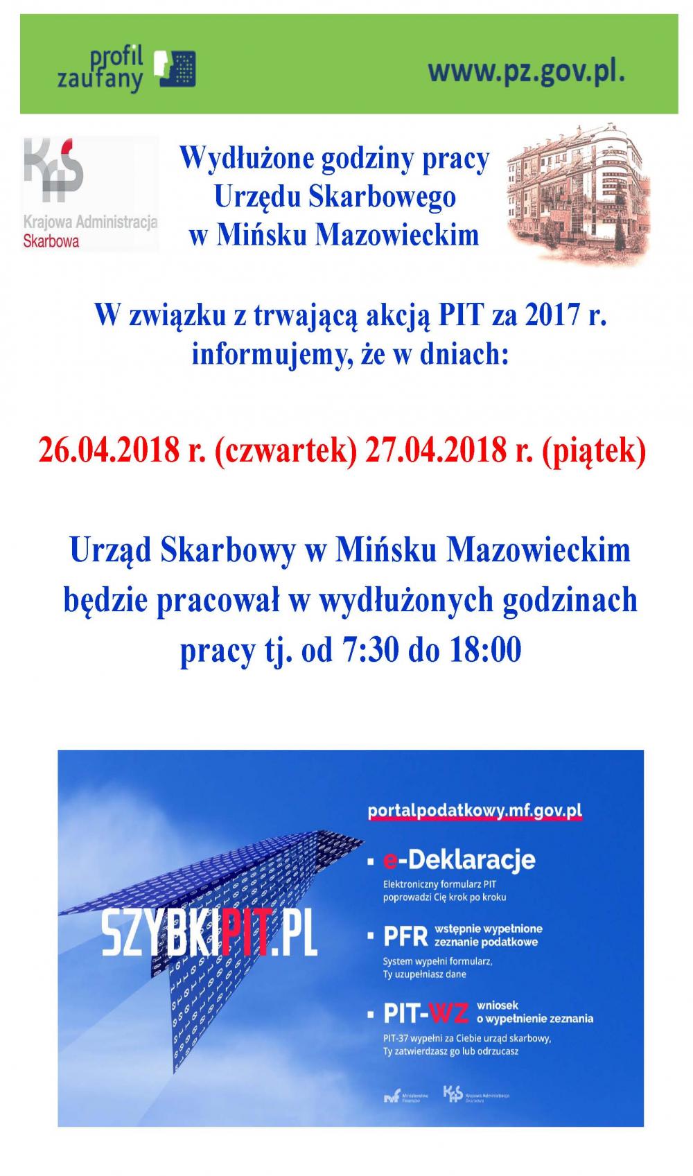 Szanowni Państwo. W związku z trwającą akcją składania zeznań rocznych „Szybki PIT” zamieszczamy plakat informacyjny nt. wydłużonych godzin pracy tut. Urzędu Skarbowego w dniach 26.04.2018 (czwartek) i 27.04.2018 (piątek) ...