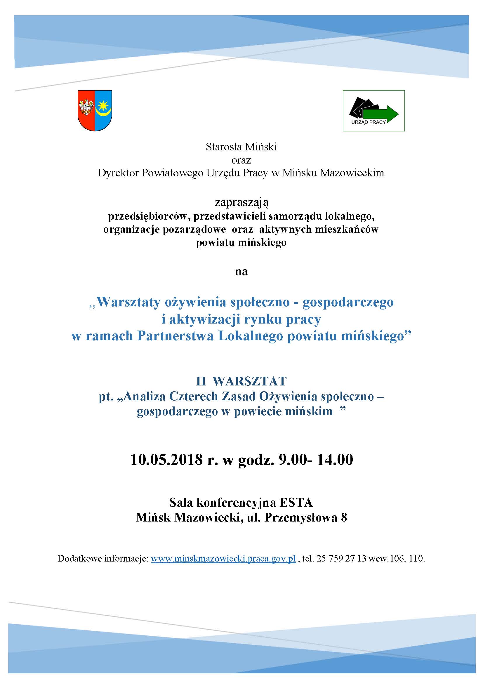 Starosta Miński oraz Dyrektor Powiatowego Urzędu Pracy w Mińsku Mazowieckim zapraszają przedsiębiorców, przedstawicieli samorządu lokalnego, organizacje pozarządowe oraz aktywnych mieszkańców powiatu mińskiego na ,,Warsztaty ożywienia społeczno - gospodarczego i aktywizacji rynku pracy w ramach Partnerstwa Lokalnego powiatu mińskiego”. II WARSZTAT pt. „Analiza Czterech Zasad Ożywienia społeczno – gospodarczego w powiecie mińskim” 10.05.2018 r. w godz. 9.00 - 14.00 Sala konferencyjna ESTA, Mińsk Mazowiecki, ul. Przemysłowa 8.