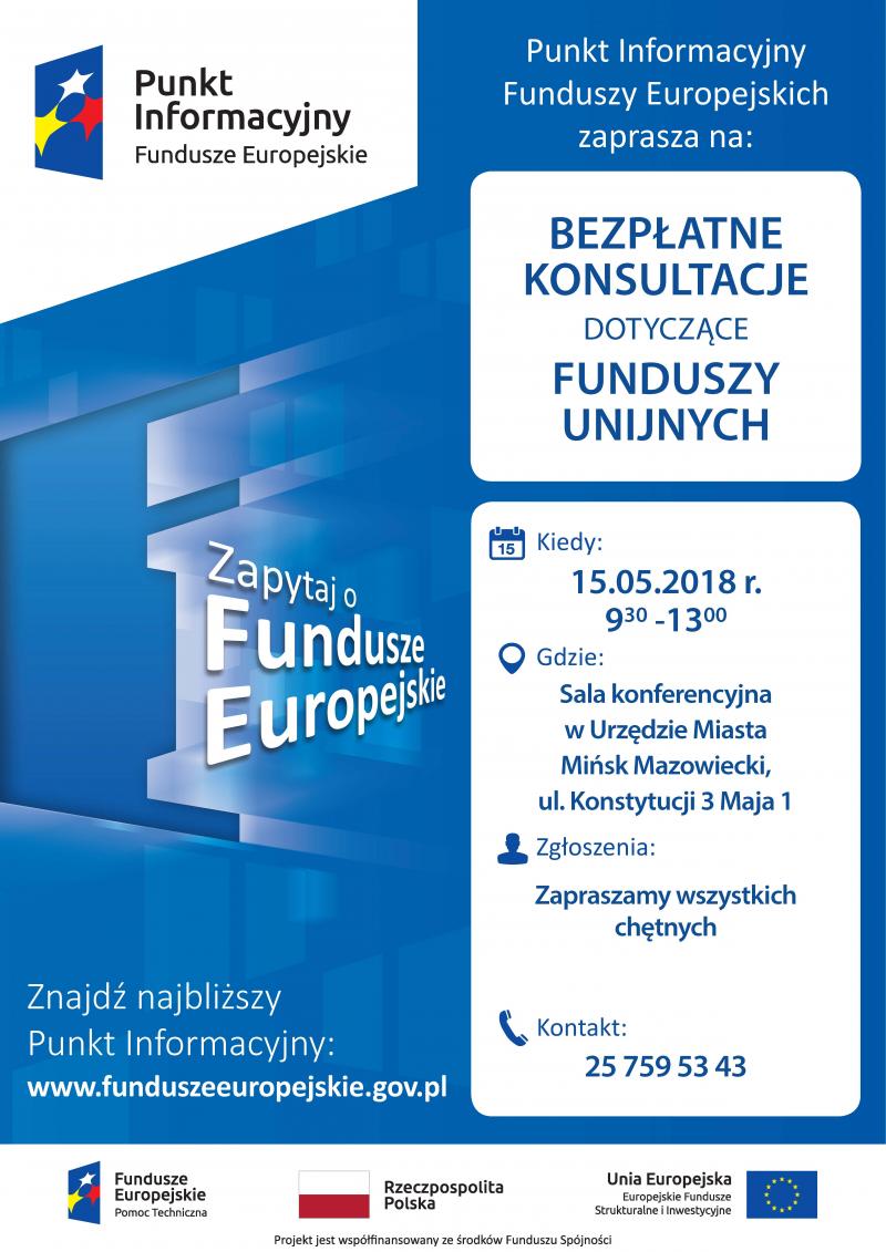 BEZPŁATNE KONSULTACJE DOTYCZĄCE FUNDUSZY UNIJNYCH - 15.05.2018 r., godz. 9.30 -13.00, sala konferencyjna w Urzędzie Miasta Mińsk Mazowiecki, ul. Konstytucji 3 Maja 1, tel. 25 759 53 43. Zapraszamy wszystkich chętnych.