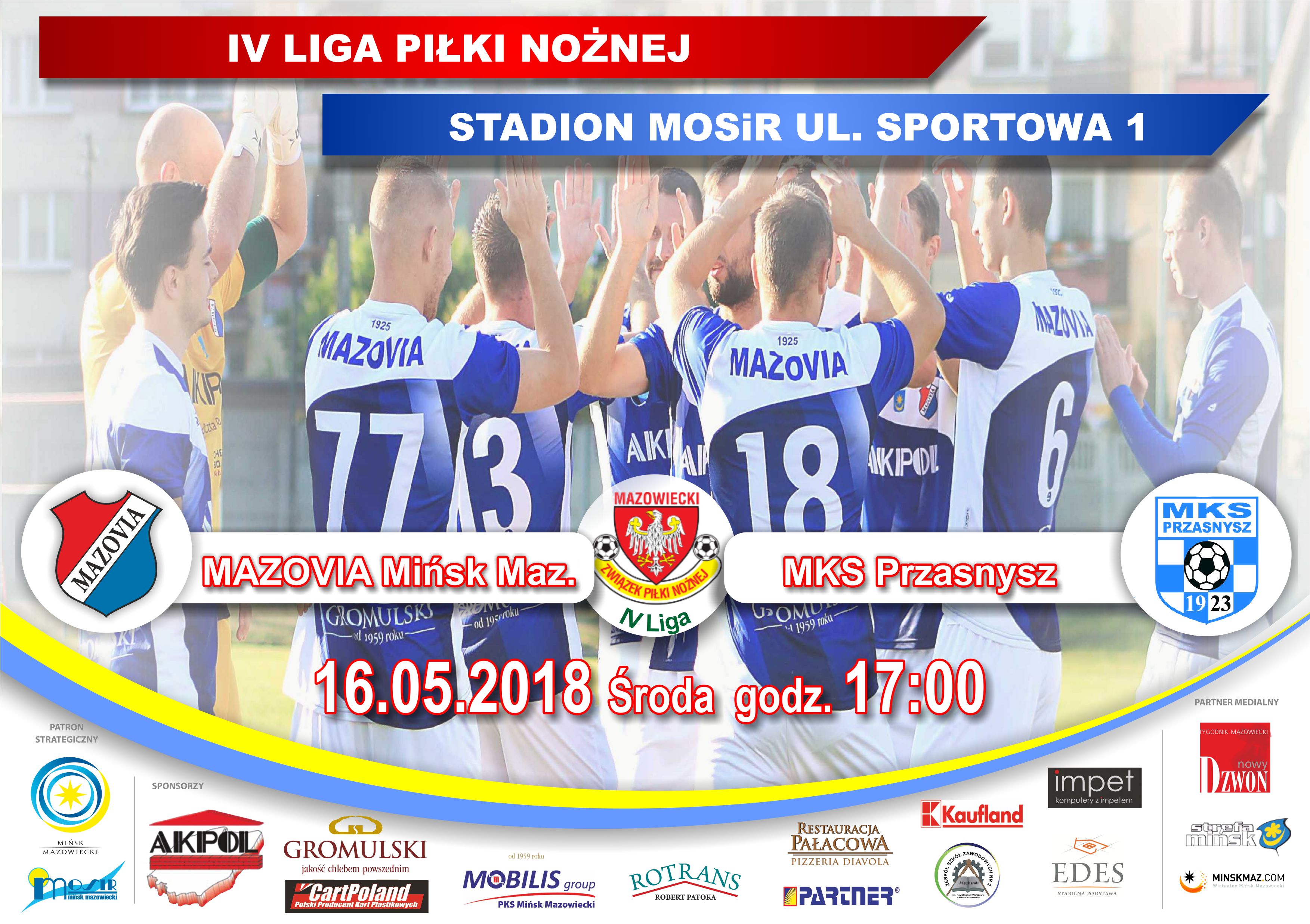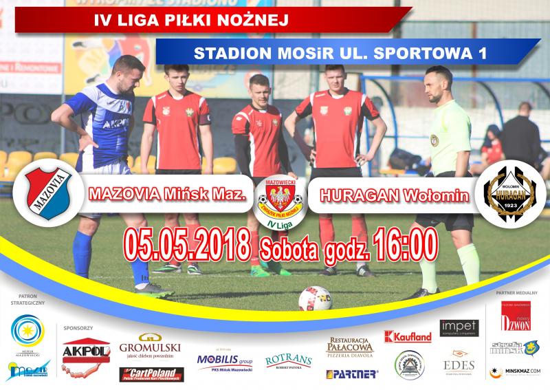 Zapraszamy na mecz IV Ligi Piłki Nożnej - MAZOVIA Mińsk Mazowiecki - HURAGAN Wołomin, 5.05.2018 4., godz. 16.00, stadion MOSiR ul. Sportowa 1