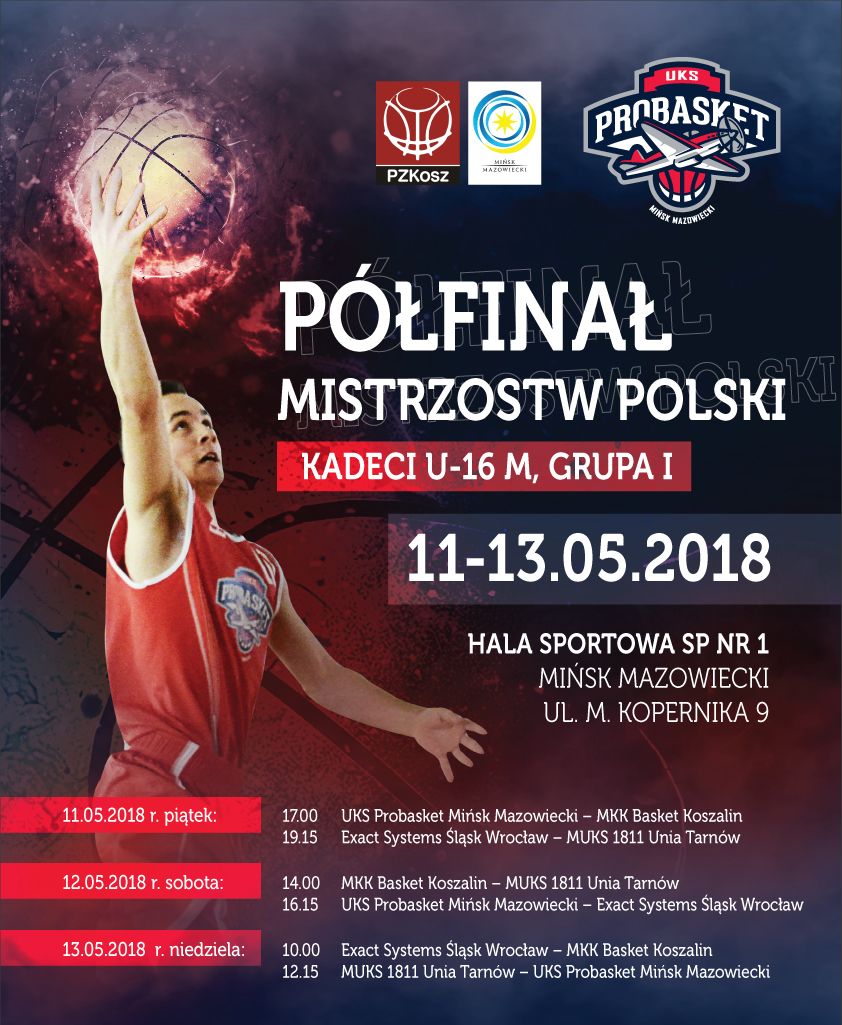 W dniach 11-13 maja 2018 r. odbędzie się Półfinał Mistrzostw Polski Kadetów w Koszykówce (Kadeci U-16 M, Grupa I), Hala Sportowa SP Nr 1, ul. Kopernika 9