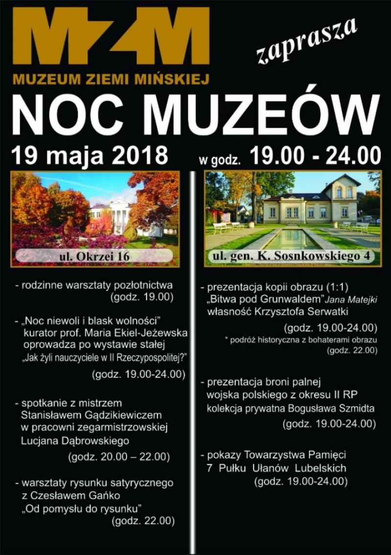 W willi hr. Łubieńskiej (ul. Okrzei 16) miały miejsce: rodzinne warsztaty pozłotnictwa i archeologii, warsztaty rysunku satyrycznego z mińskim artystą Czesławem Gańko, którego prace można było oglądać w muzeum do 20 maja, spotkanie z zegarmistrzem Stanisławem Gądzikiewiczem w muzealnej pracowni zegarmistrzowsko-jubilersko-optycznej Lucjana Dąbrowskiego oraz zwiedzanie z kuratorem stałej ekspozycji o realiach życia w II RP (szczegóły poniżej). Podczas spacerów po kolejnych ekspozycjach MZM, zwiedzający mogli rozwiązać krzyżówkę lub quiz sprawdzający ich wiedzę na temat lokalnej historii.
