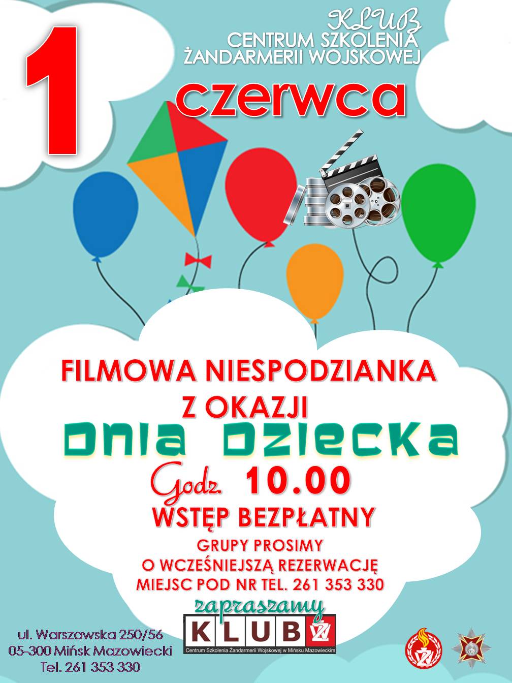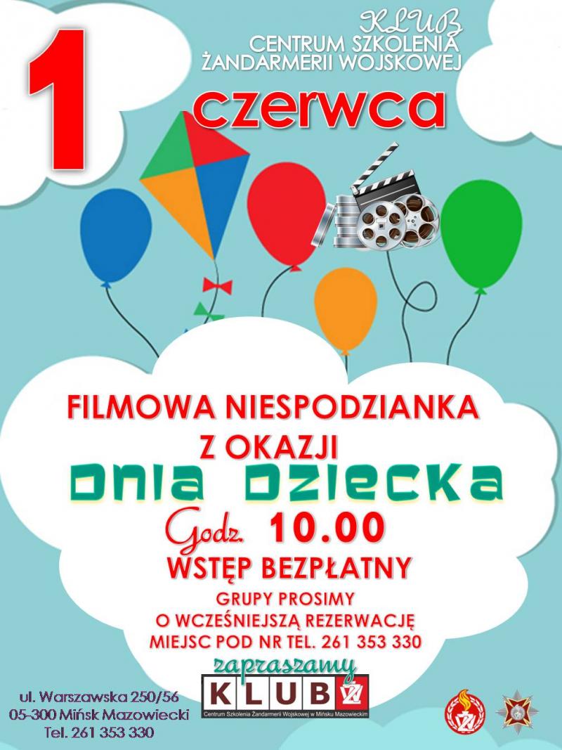 1 czerwca 2018 r.o godz. 10.00. Klub Centrum Szkolenia Żandarmerii Wojskowej zaprasza dzieci na "FILMOWĄ NIESPODZIANKĘ Z OKAZJI DNIA DZIECKA".