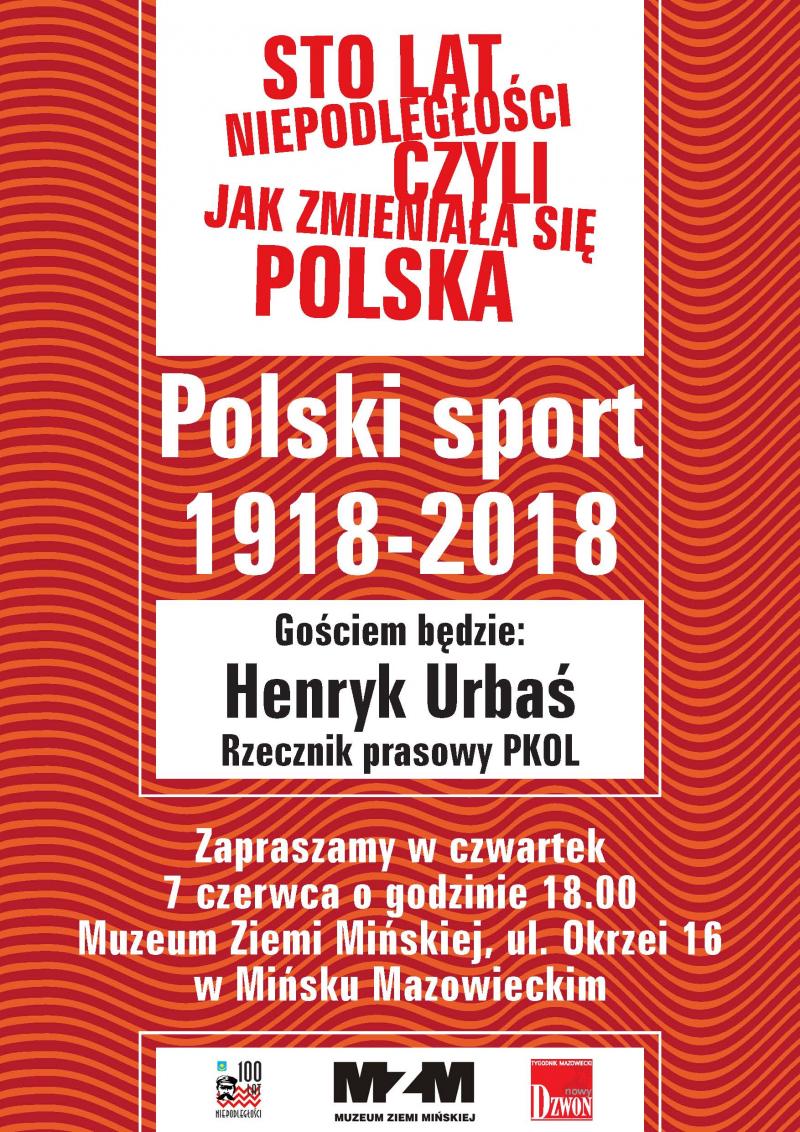 Zapraszamy w czwartek 7 czerwca o godz. 18.00 do Muzeum Ziemi Mińskiej na spotkanie z Henrykiem Urbasiem - Rzecznikiem prasowym PKOL - pt. "Polski sport 1918 - 2018" - z cyklu STO LAT NIEPODLEGŁOŚCI - CZYLI JAK ZMIENIAŁA SIĘ POLSKA