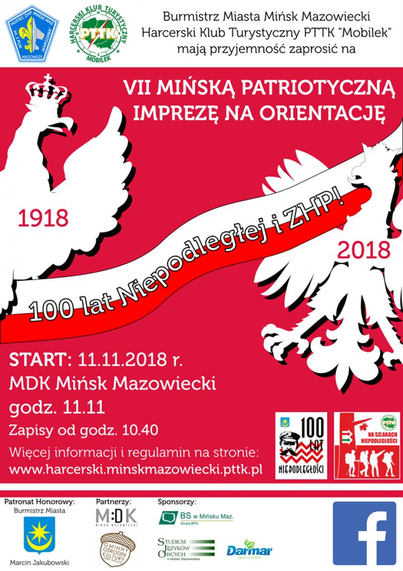 "Harcerski Klub Turystyczny PTTK "Mobilek" już po raz siódmy zaprasza mieszkańców miasta, ale i nie tylko, na Mińską Patriotyczną Imprezę na Orientację - grę miejską z elementami historii i aktywności ruchowej. Celem imprezy jest radosne i aktywne świętowanie 100-lecia niepodległości. Start: 11.11.2018 r. godz.11.11. Zapisy od godz. 10.40. Szczegóły w wydarzeniu na facebooku: www.facebook.com/events/477595889401252/?active_tab=about