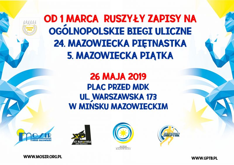 Ruszyły zapisy na Ogólnopolskie Biegi uliczne "Mazowiecką Piętnastkę" i "Mazowiecką Piątkę". Impreza odbędzie się 26 maja 2019 r. Start na placu przed MDK, ul. Warszawska 173.