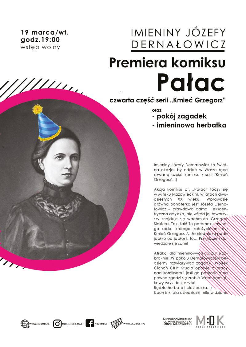 Akcja komiksu pt. „Pałac” toczy się w Mińsku Mazowieckim, w latach dwudziestych XX wieku. Wprawdzie główną bohaterką jest Józefa Dernałowicz – prawdziwa dama i ekscentryczna artystka, ale wśród jej towarzyszy znajduje się wachmistrz Grzegorz Siekiera. Tak, tak! To potomek sławnego rodu, którego założycielem był Kmieć Grzegorz. A, że niedaleko pada jabłko od jabłoni, to… Przyjdźcie i dowiedzcie się sami!