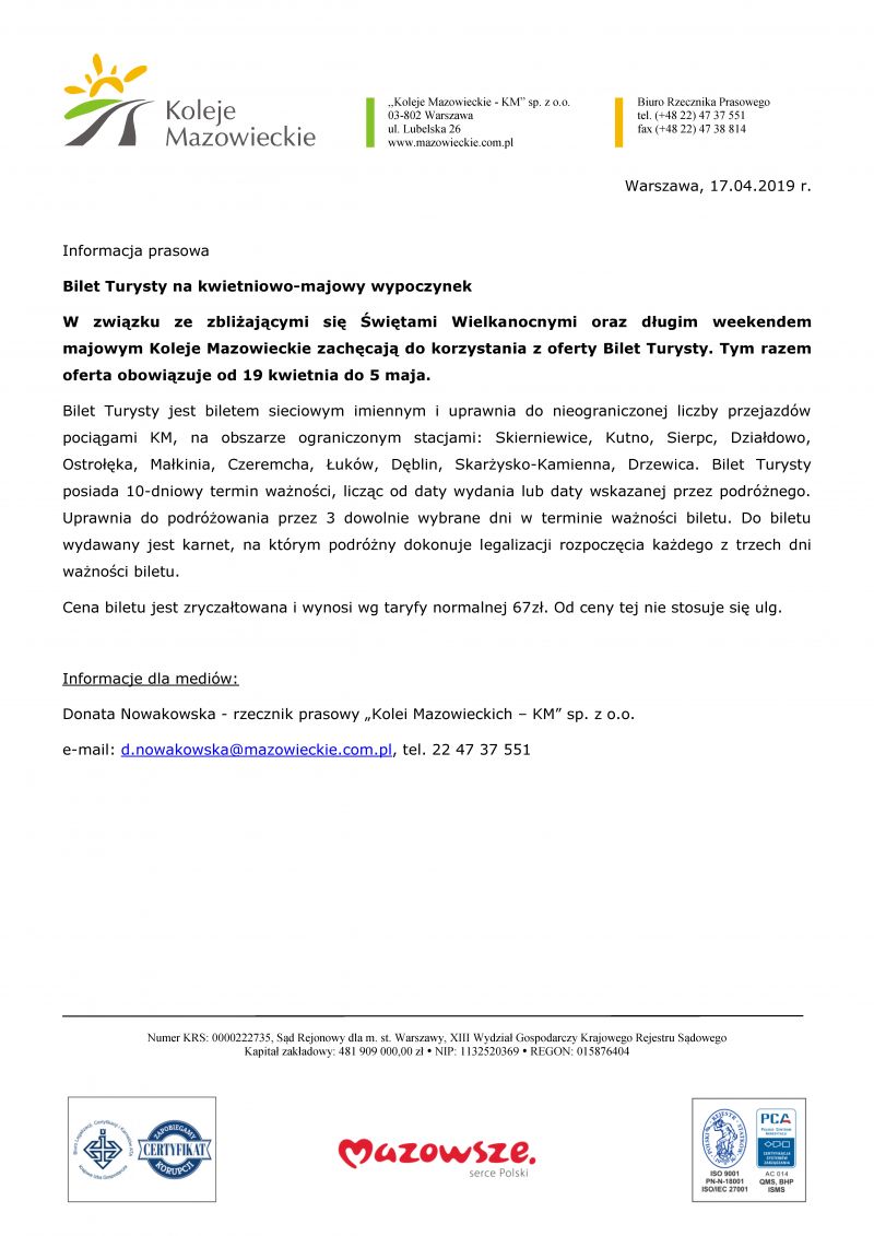 W związku ze zbliżającymi się Świętami Wielkanocnymi oraz długim weekendem majowym Koleje Mazowieckie zachęcają do korzystania z oferty Bilet Turysty. Tym razem oferta obowiązuje od 19 kwietnia do 5 maja...