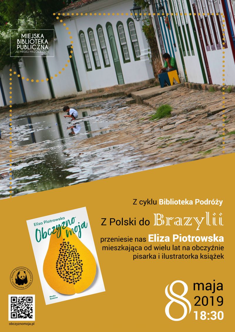 8 maja, o godz. 18:30 w naszej Bibliotece w ramach cyklu Biblioteka Podróży przeniesiemy się do największego kraju Ameryki Południowej, stolicy karnawałowego szaleństwa i soczystej papai. W kolorowy brazylijski klimat zabierze nas nasz gość – Eliza Piotrowska, która od 2011 r. mieszka w Brazylii. Jest autorką i ilustratorką bajek dla dzieci, tłumaczem języka włoskiego, jak również krytykiem sztuki. Jej najnowsza książka „Obczyzno moja” została zakwalifikowana do 13. edycji Literackiej Nagrody Europy Środkowej Angelus.