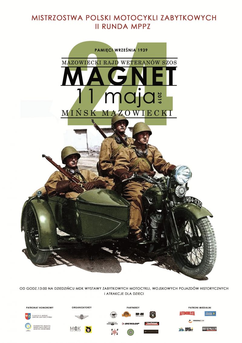 Klub Dawnych Motocykli "MAGNET" zaprasza na XXIV Mazowiecki Rajd Weteranów Szos "MAGNET 2019". Rajd odbędzie się w dniach 10 - 12 maja 2019 r. w Mińsku Mazowieckim i będzie motocyklową rundą Mistrzostw Polski Pojazdów Zabytkowych. Do rajdu dopuszczone zostaną WYŁĄCZNIE motocykle wyprodukowane do 31.12 1988 r. Mieszkańców zapraszamy w dniu 11 maja 2019, od godz. 13.00, na plac przed MDK.