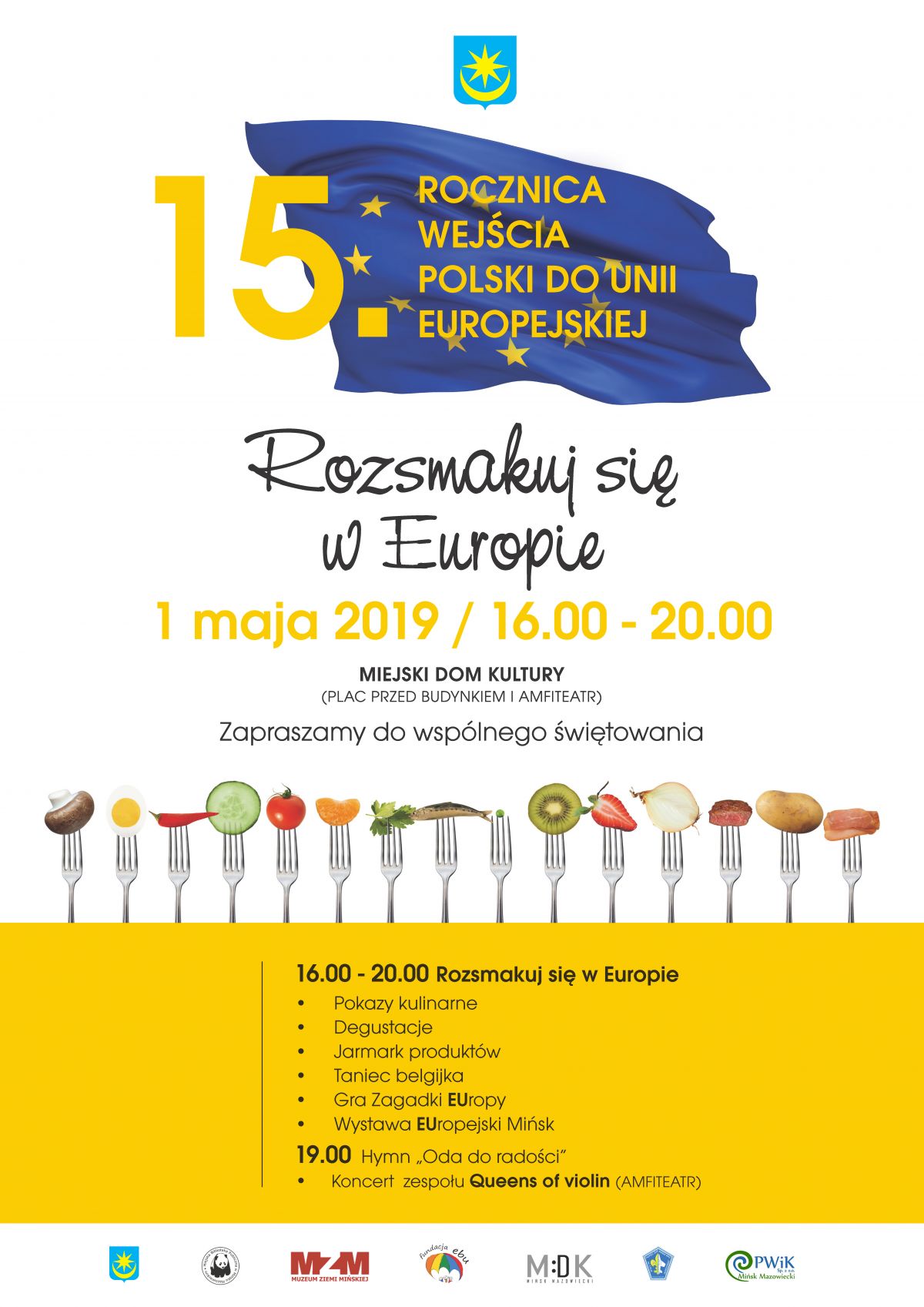 Z okazji 15. rocznicy wejścia Polski do Unii Europejskiej zapraszamy 1 maja od godz. 16.00 na wydarzenie "Rozsmakuj się w Europie", plac przed Miejskim Domem Kultury oraz amfiteatr MDK. Godz. 19.00 koncert zespołu "Queens of Violin". Szczegóły na plakacie...