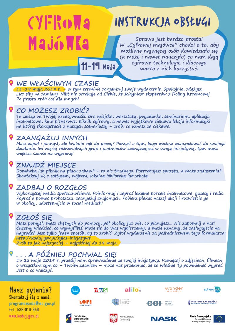 Sprawa jest bardzo prosta. W „Cyfrowej majówce” chodzi o to, aby możliwie najwięcej osób dowiedziało się (a może i nawet nauczyło) co nam dają cyfrowe technologie i dlaczego warto z nich korzystać. Zaproście seniorów i pokażcie im jak korzystać z poczty e-mail. Skrzyknijcie miejscowe dzieciaki i rozpocznijcie przygodę z programowaniem. Poopowiadajcie sąsiadom jak nie dać się oszukać w Internecie i na co tam uważać. A wszystko w niezobowiązującej, majówkowej atmosferze. Po co to wszystko? Bo warto dać innym coś od siebie i pomóc im lepiej zrozumieć Internet!
