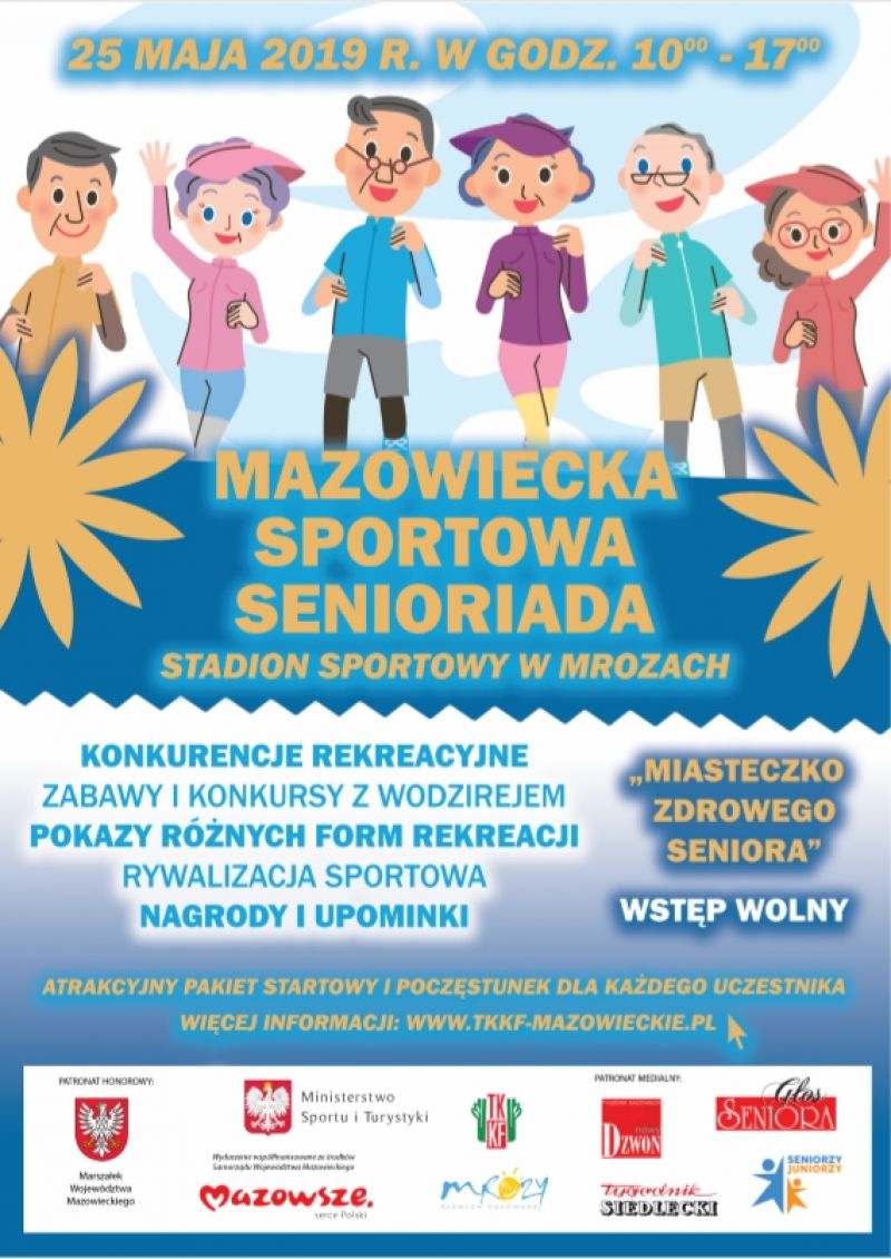 Zapraszamy do udziału w MAZOWIECKIEJ SPORTOWEJ SENIORIADZIE 2019. Będzie to wydarzenie o charakterze imprezy sportowo-rekreacyjnej z elementami rywalizacji. Odbędzie się 25 maja 2019 w godz.10.00 -17.00 na obiektach sportowych w Mrozach.