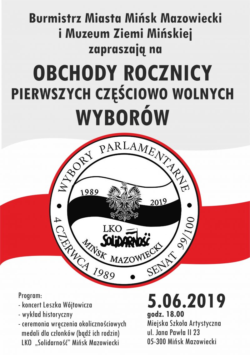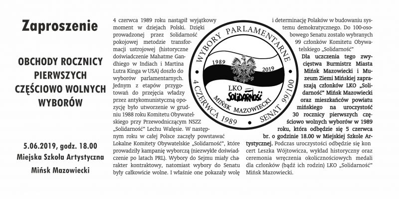 4 czerwca 1989 roku nastąpił wyjątkowy moment w dziejach Polski. Dzięki prowadzonej przez Solidarność pokojowej metodzie transformacji ustrojowej (historyczne doświadczenie Mahatme Gandhiego w Indiach i Martina Luthera Kinga w USA) doszło do wyborów parlamentarnych. Jednym z etapów przygotowań do przejęcia władzy przez antykomunistyczną opozycję było utworzenie w grudniu 1988 roku Komitetu Obywatelskiego przy Przewodniczącym NSZZ „Solidarność” Lechu Wałęsie. W następnym roku w całej Polsce zaczęły powstawać Lokalne Komitety Obywatelskie „Solidarność”, które prowadziły kampanię wyborczą (niezwykłe doświadczenie po latach PRL). Wybory do Sejmu miały charakter kontraktowy, natomiast wybory do Senatu były całkowicie wolne. I właśnie one pokazały wolę i determinację Polaków w budowaniu systemu demokratycznego. Do 100-osobowego Senatu zostało wybranych 99 członków Komitetu Obywatelskiego „Solidarność”. Dla uczczenia tego zwycięstwa Burmistrz Miasta Mińsk Mazowiecki i Muzeum Ziemi Mińskiej zapraszają członków LKO „Solidarność” Mińsk Mazowiecki oraz mieszkańców powiatu mińskiego na uroczystość 30. rocznicy pierwszych częściowo wolnych wyborów w 1989 roku, która odbędzie się 5 czerwca br. o godzinie 18.00 w Miejskiej Szkole Artystycznej. Podczas uroczystości koncert zagra legendarny bard Leszek Wójtowicz, wykład historyczny wygłosi prezes Ośrodka KARTA Zbigniew Gluza, a członkom LKO „Solidarność” Mińsk Mazowiecki (bądź ich rodzinom) wręczone zostaną okolicznościowe medale.