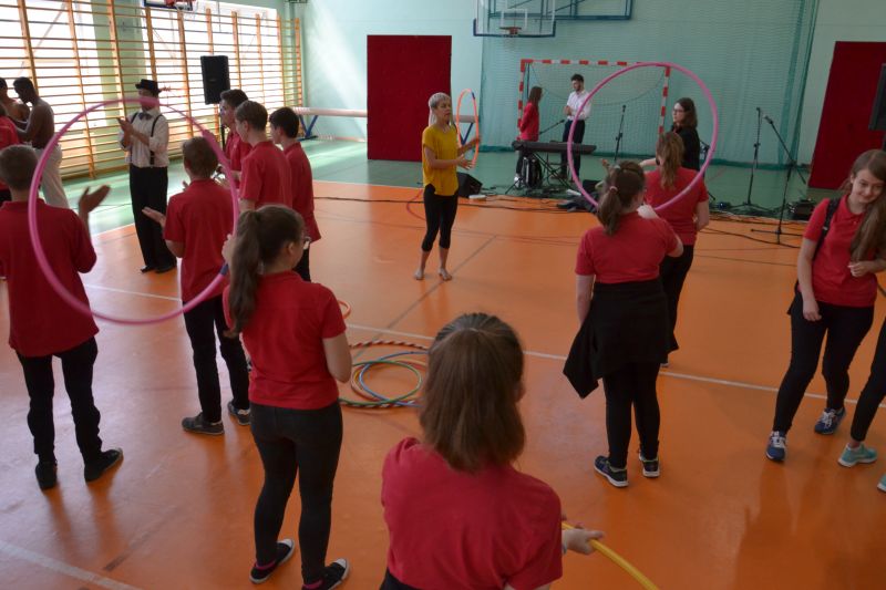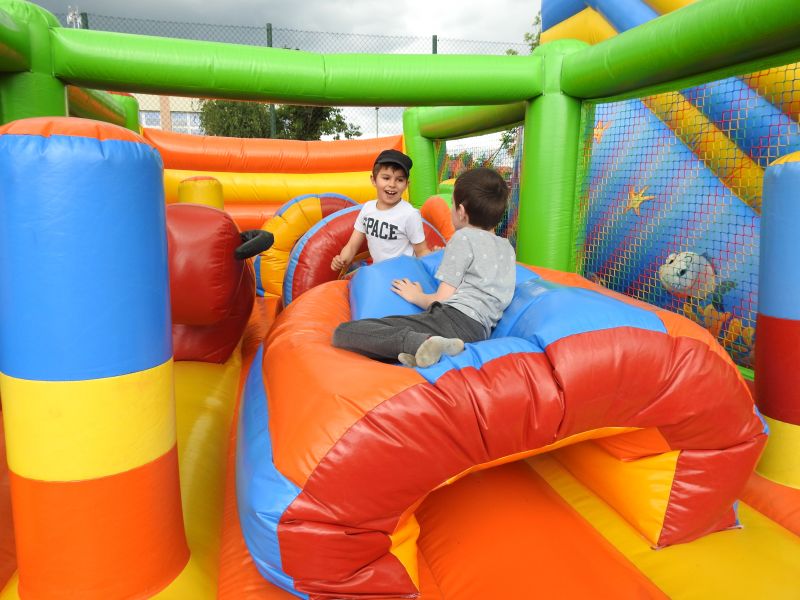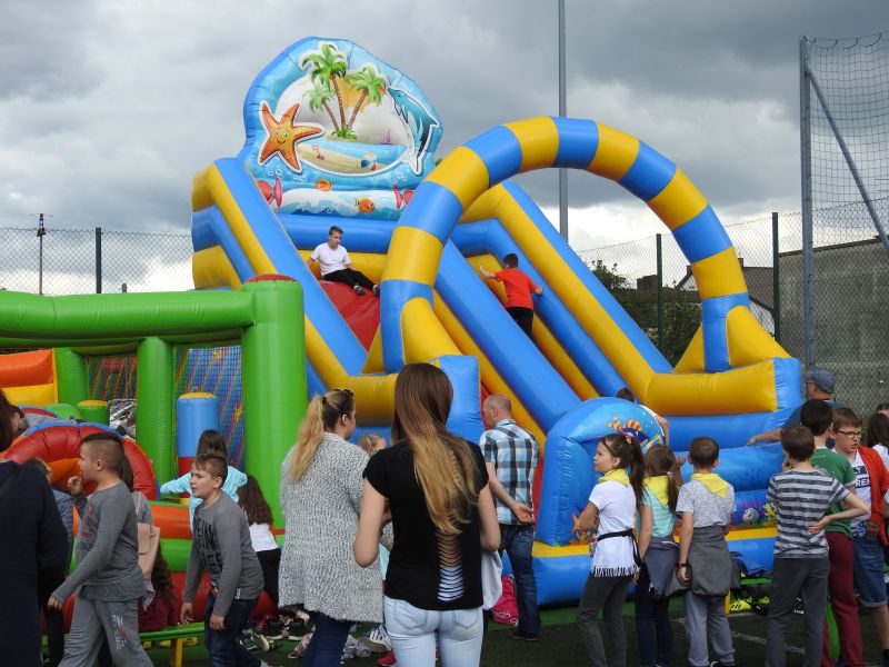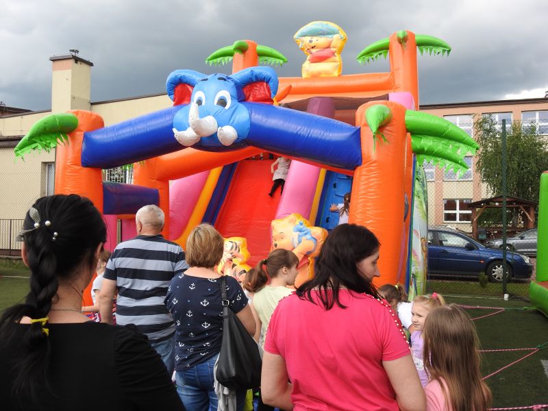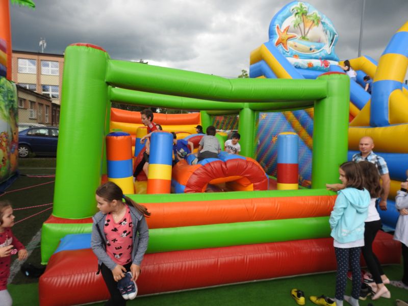 Dopełnieniem atrakcji dzisiejszego dnia był popołudniowy festyn rodzinny z okazji zbliżającego się Dnia Matki i Dnia Dziecka. Rada Rodziców przygotowała wiele atrakcji i niespodzianek. Niestety pogoda spłatała figla. Ulewny deszcz spowodował, że plenerowa zabawa została przeniesiona pod dach szkoły. Dmuchane zjeżdżalnie, trampoliny, ścianę wspinaczkową rozstawione na boisku Orlika musiały, ku rozczarowaniu dzieci, zastąpić zabawy, konkursy i taniec pod dachem. Sale gimnastyczne stały się miejscem , gdzie pod okiem animatorów uczniowie miło spędzali czas. Frajdą dla młodych uczestników pikniku było kolorowanie twarzy i włosów. Balony, wata cukrowa, popcorn i lody osłodziły smutek niezrealizowanych w pełni planów dzisiejszego dnia.