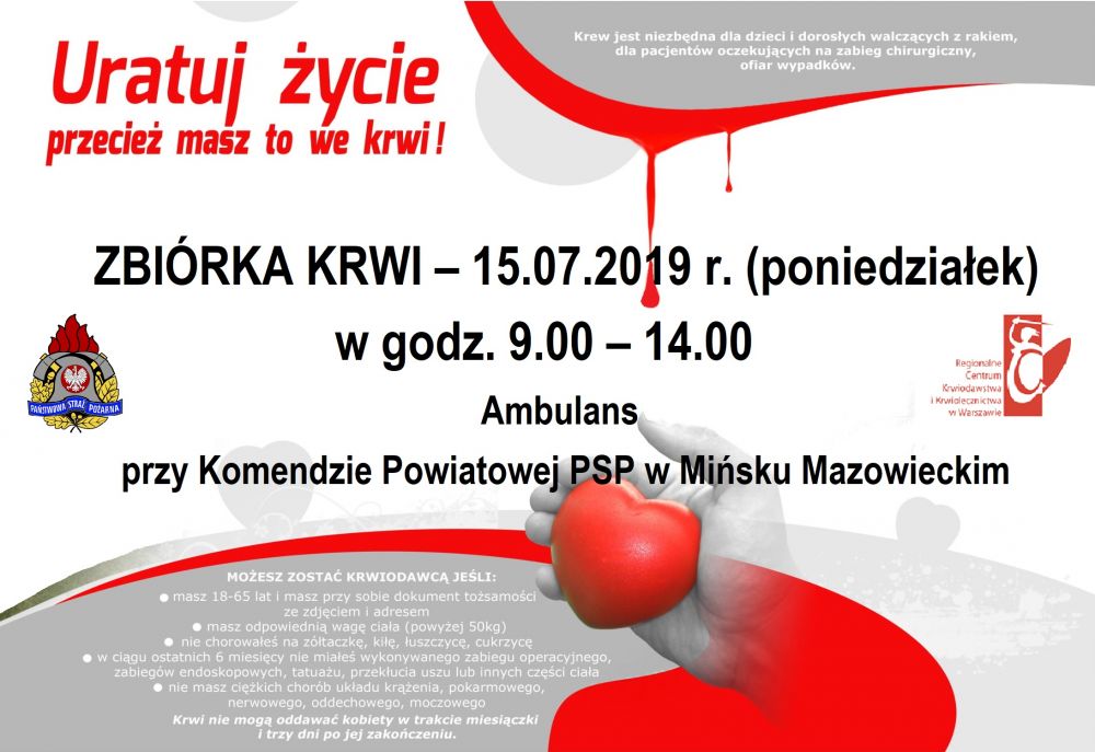 Zachęcamy do wzięcia udziału w zbiórce krwi, która odbędzie się 15.07.2019 r. przy Komendzie Powiatowej Państwowej Straży Pożarnej w Mińsku Mazowieckim.