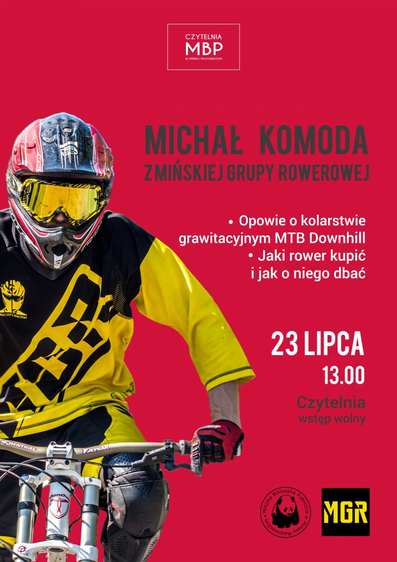 Jeśli chcesz poczuć smak przygody, koniecznie posłuchaj opowieści Michała Komody - znanego zjazdowca z Mińskiej Grupy Rowerowej, który uprawia kolarstwo grawitacyjne MTB Downhill. Będzie też pokaz zdjęć z udziału w zawodach!