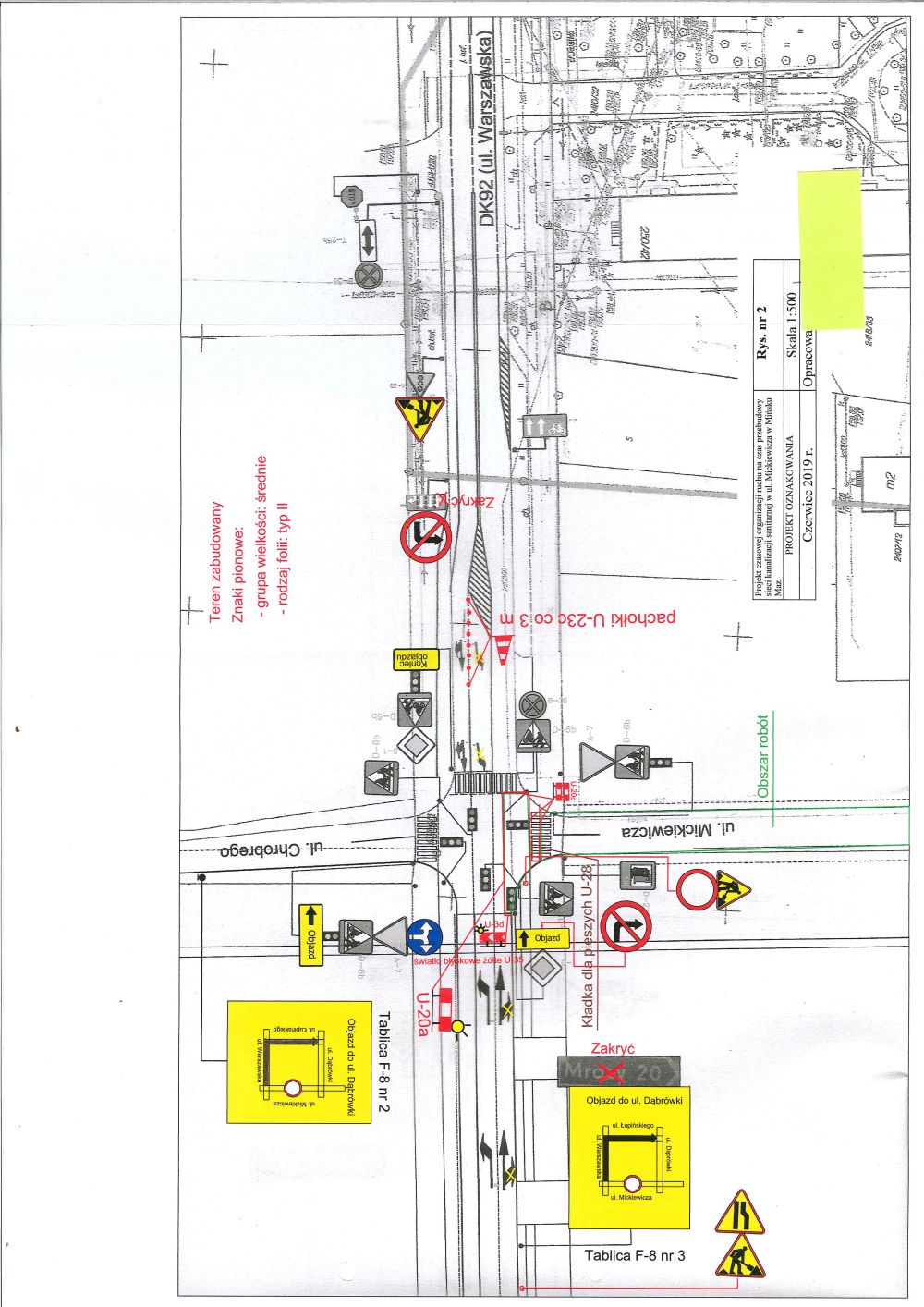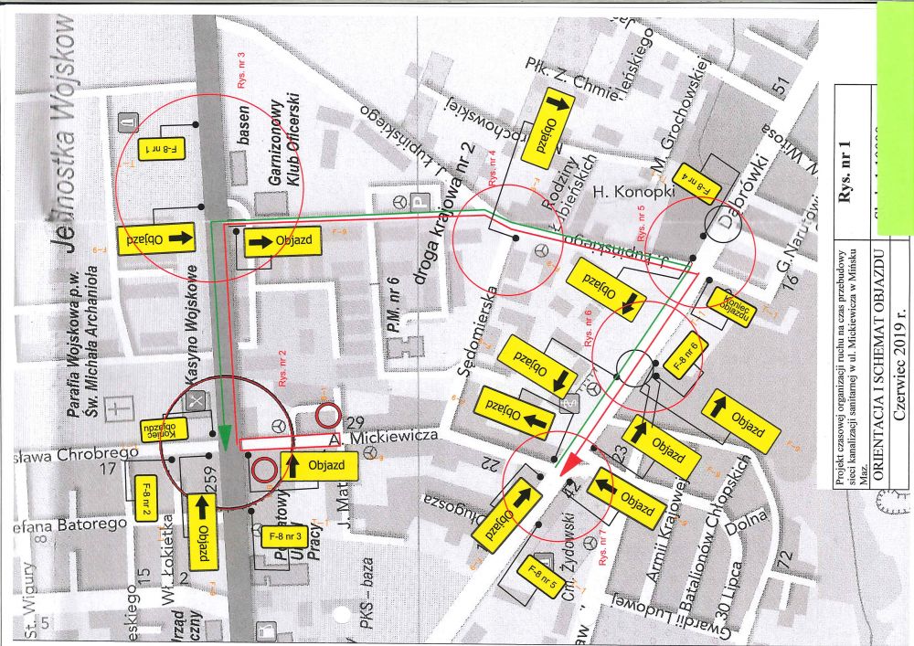 W związku z przebudową odcinka sieci kanalizacji sanitarnej w drodze powiatowej ul. Mickiewicza na odcinku pomiędzy ulicami Warszawską i Matejki planowane jest zamknięcie dla ruchu pojazdów odcinka ul. Mickiewicza. W ramach prowadzonych prac i powstałych utrudnień w ruchu zostaną wyznaczone objazdy poprzez ulice Łupińskiego, Dąbrówki i Warszawską. Wprowadzenie czasowej organizacji ruchu planowane jest od 1 sierpnia br. Roboty będą prowadzone przez kilka tygodni. W załączeniu schemat czasowej organizacji ruchu.