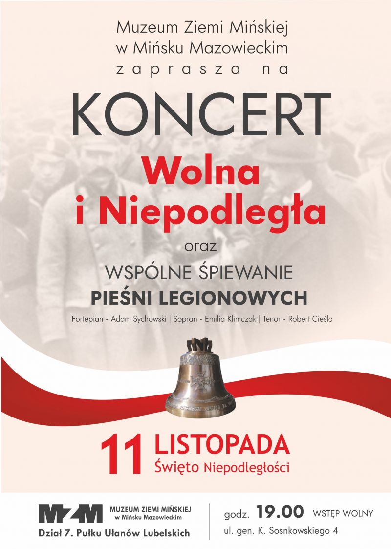 Koncert „Wolna i Niepodległa” oraz wspólne śpiewanie pieśni legionowych były częścią obchodów Święta Niepodległości w Mińsku Mazowieckim. Koncert w wykonaniu Adama Sychowskiego na fortepianie oraz wokalistów Emilli Klimczak i Roberta Cieśli wzruszył publiczność momentami do łez. Artyści porwali wszystkich obecnych do wspólnego śpiewania i przeżywania Święta Niepodległości w wyjątkowym otoczeniu malarstwa i pamiątek związanych z walczącymi o wolność ułanami. Wśród utworów znalazły się takie tytuły jak: „Pierwsza kadrowa” , „Przybyli ułani pod okienko”, „O mój rozmarynie”, „Pieśń o wodzu miłym”, czy melodia z filmu „Polskie drogi”.