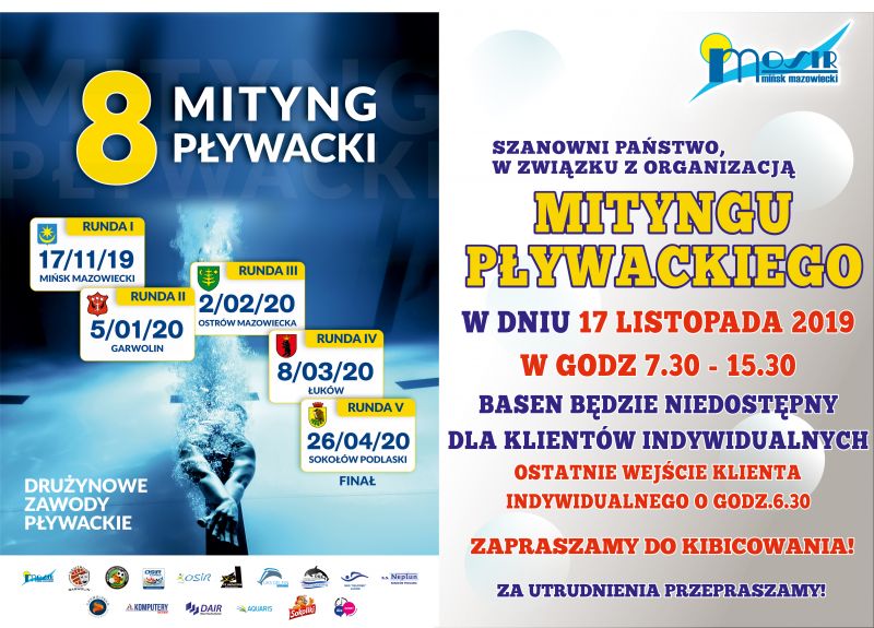 Zapraszamy do udziału w mityngu pływackim MOSiR 17 listopada 2019. W tym dniu basen będzie nieczynny dla klientów indywidualnych.