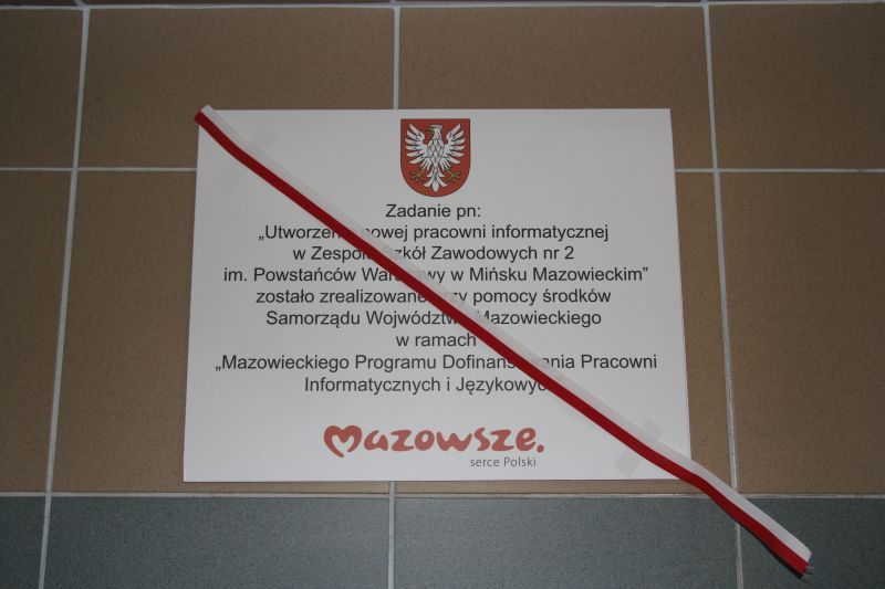 Zespół Szkół Zawodowych nr 2 im. Powstańców Warszawy w Mińsku Mazowieckim realizuje Mazowiecki Program Dofinansowania Pracowni Informatycznych i Językowych przy pomocy środków Samorządu Województwa Mazowieckiego oraz Powiatu Mińskiego.